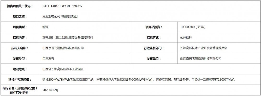 11月26日,漳泽发电公司飞轮储能项目招标计划发布。