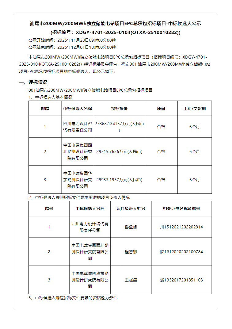能源圈获悉,11月28日,汕尾市200MW/200MWH独立储能电站项目EPC总承包招标项目-中标候选人公示。