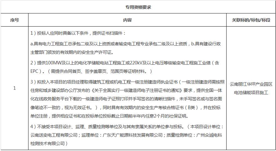 本招标项目南网储能公司云南丽江华坪产业园区电池储能项目施工公开招标项目,招标人为南方电网储能股份有限公司,项目资金来自自筹资金,该项目已具备招标条件,现对本项目进行公开招标。