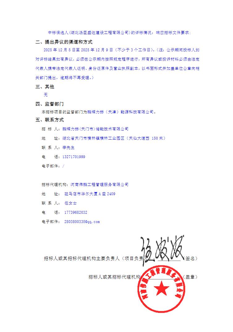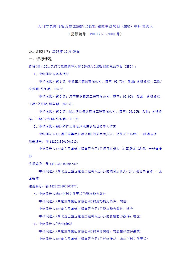 12月4日,天门市竞陵鹏辉力赫220MW/401MWh储能电站项目(EPC)中标候选人公示。
