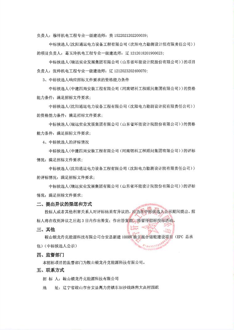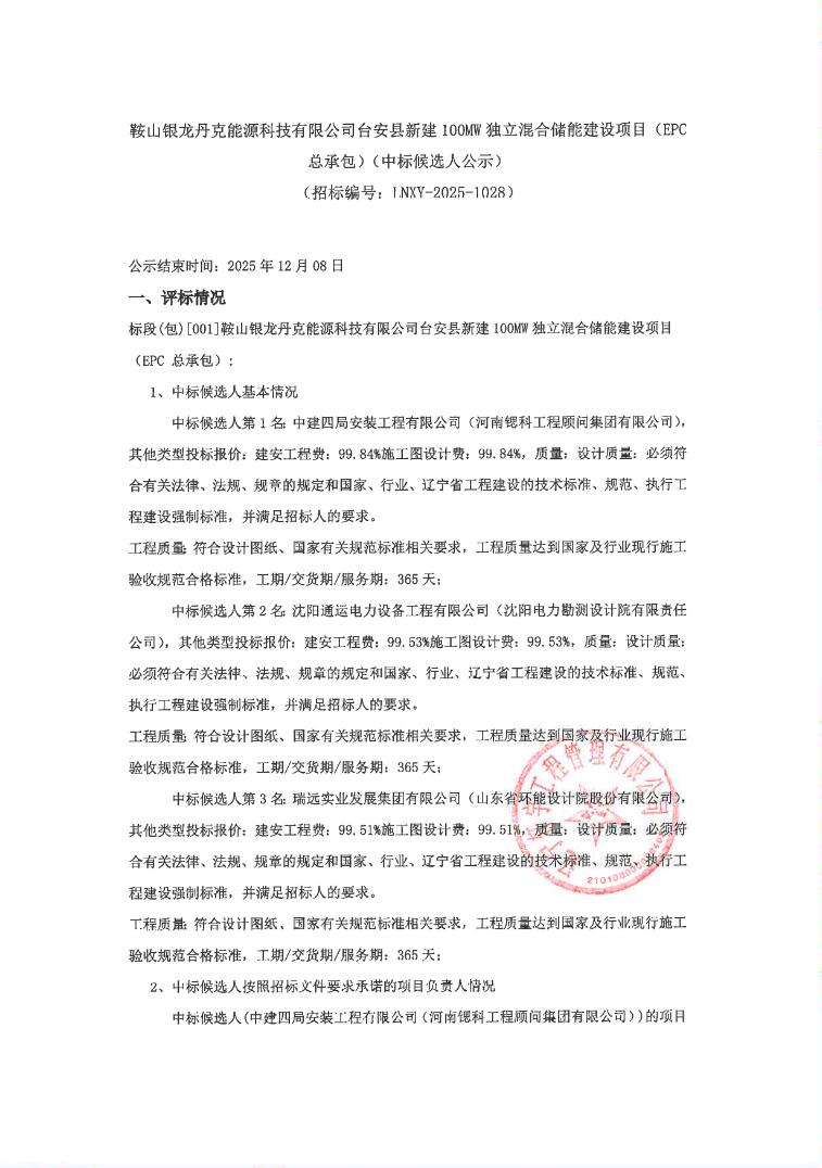 12月3日,鞍山银龙丹克能源科技有限公司台安县新建100MW独立混合储能建设项目(EPC总承包)中标候选人公示。