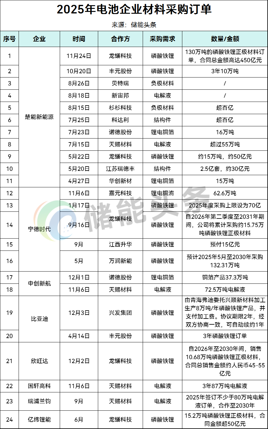据能源圈统计,2025年至今,包括宁德时代、亿纬锂能、国轩高科、中创新航、楚能新能源等一众电池企业纷纷向上游产业链“锁单”,涉及磷酸铁锂、负极材料、电解液、锂电铜箔、结构件等各个领域。