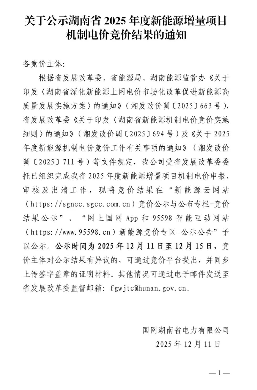 能源圈获悉,12月11日,湖南省机制电价竞价结果公示,光伏机制电价为0.375元/度,风电机制电价为0.33元/度。