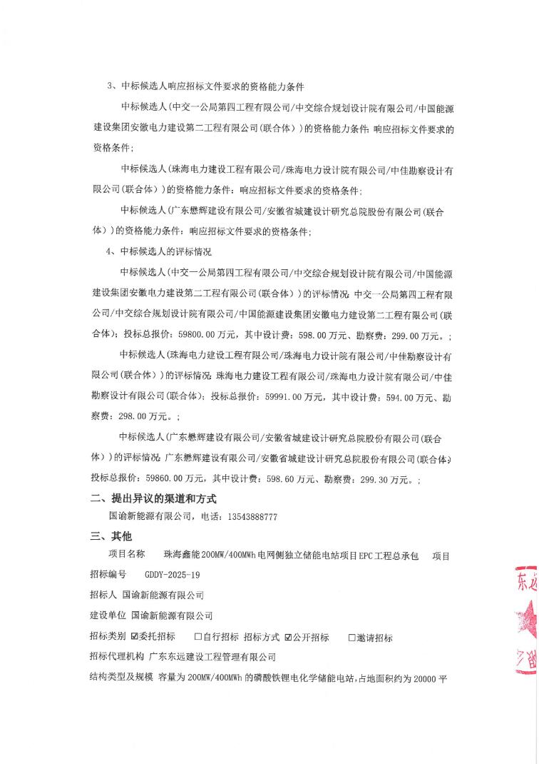 第二中标候选人为珠海电力建设工程有限公司/珠海电力设计院有限公司/中佳勘察设计有限公司(联合体),投标报价59991万元,折合单价1.4998元/Wh;
