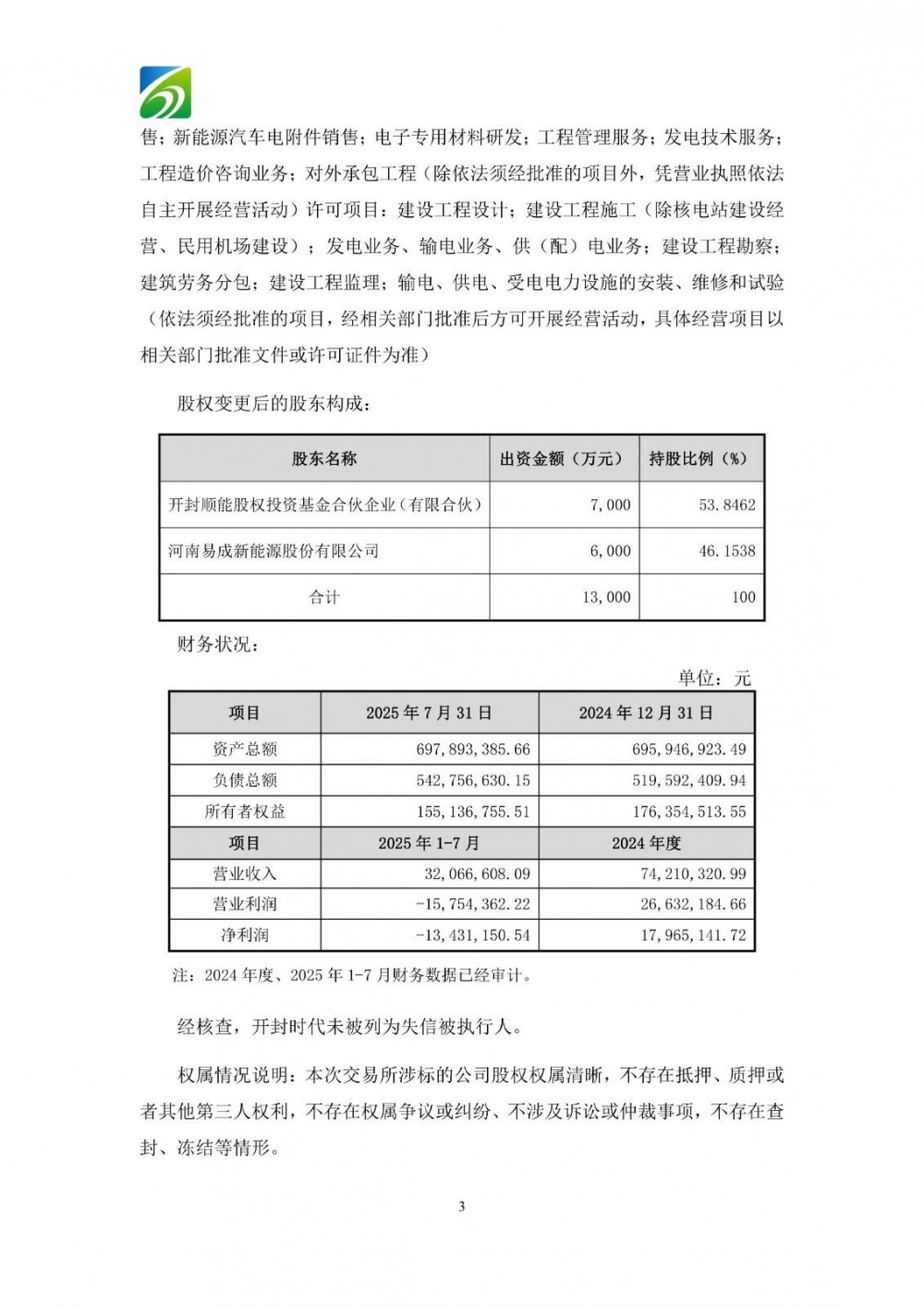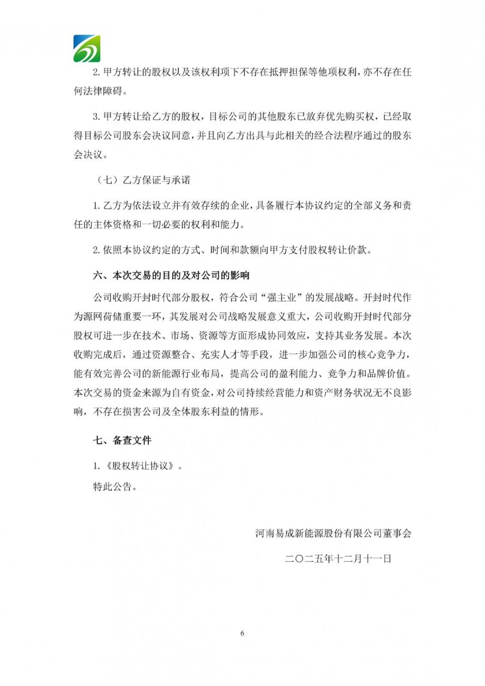 易成新能表示,公司收购开封时代部分股权,符合公司“强主业”的发展战略。开封时代作为源网荷储重要一环,其发展对公司战略发展意义重大,公司收购开封时代部分股权可进一步在技术、市场、资源等方面形成协同效应,支持其业务发展。本次收购完成后,通过资源整合、充实人才等手段,进一步加强公司的核心竞争力,能有效完善公司的新能源行业布局,提高公司的盈利能力、竞争力和品牌价值。本次交易的资金来源为自有资金,对公司持续经营能力和资产财务状况无不良影响,不存在损害公司及全体股东利益的情形。