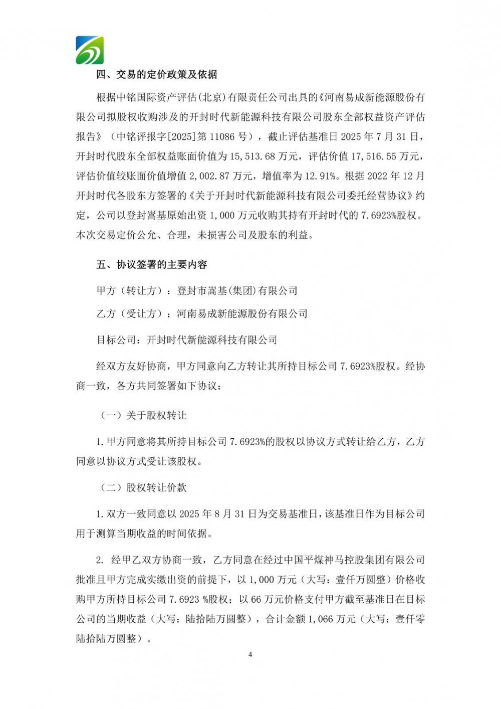 12月11日,易成新能发布公告称,公司将以1,000万元收购登封市嵩基(集团)有限公司持有的开封时代新能源科技有限公司7.6923%股权,本次收购完成后,公司将持有开封时代46.1538%股权。