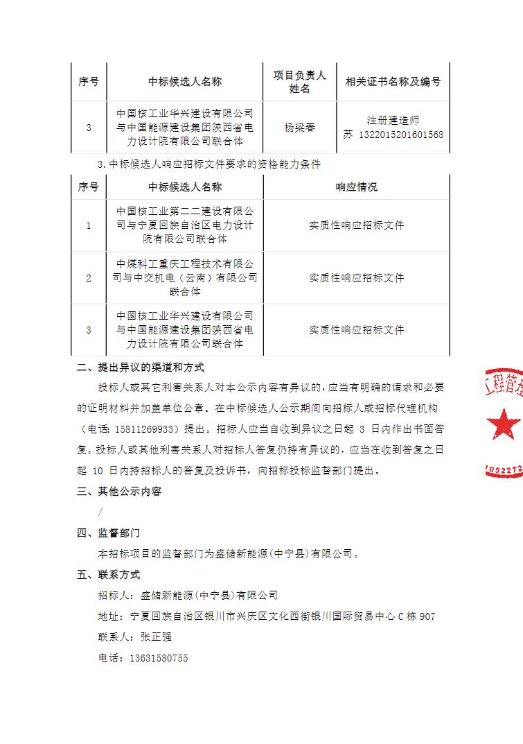 第一中标候选人为中国核工业第二二建设有限公司与宁夏回族自治区电力设计院有限公司联合体,投标报价为1919886000元,折合单价0.9999元/Wh;第二中标候选人为中煤科工重庆工程技术有限公司与中交机电(云南)有限公司联合体,投标报价为2058001204.85元,折合单价1.0719元/Wh;第三中标候选人为中国核工业华兴建设有限公司与中国能源建设集团陕西省电力设计院有限公司联合体,投标报价为2081115077.18元,折合单价1.0839元/Wh。