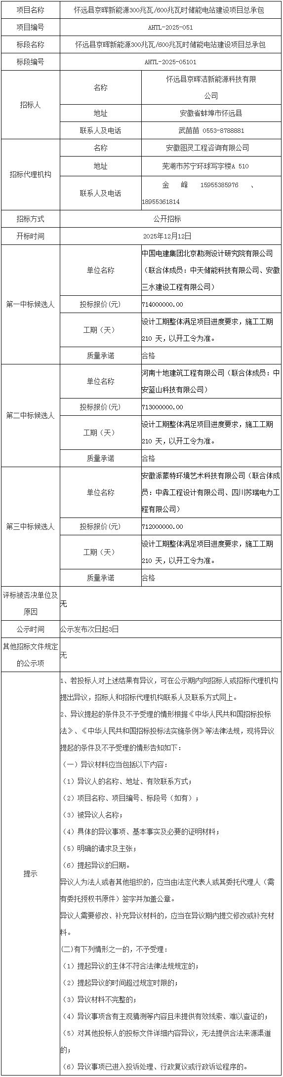 第一中标候选人为中国电建集团北京勘测设计研究院有限公司、中天储能科技有限公司、安徽三水建设工程有限公司联合体,投标报价为714000000元,折合单价1.19元/Wh;第二中标候选人为河南十地建筑工程有限公司、中安蓝山科技有限公司联合体,投标报价为713000000元,折合单价1.1883元/Wh;第三中标候选人为安徽派蒙特环境艺术科技有限公司、中犇工程设计有限公司、四川苏瑞电力工程有限公司联合体,投标报价为712000000元,折合单价1.1867元/Wh。