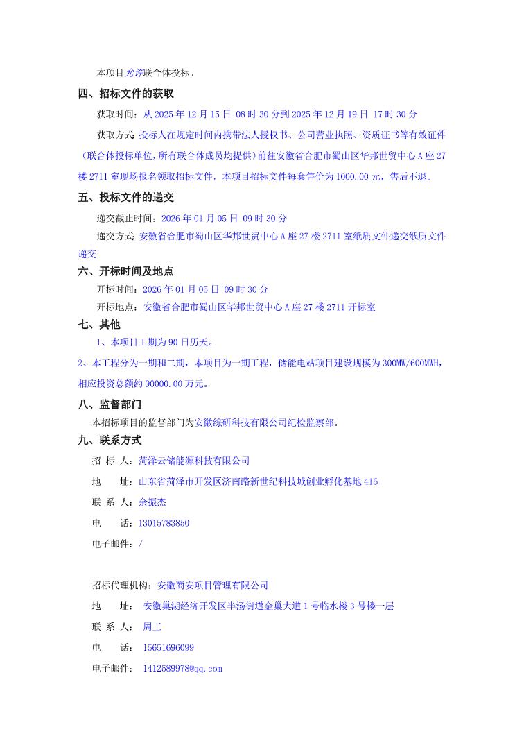 12月15日,菏泽云储循环共享储能400MW/800MWh储能电站一期工程EPC总承包项目招标公告发布。