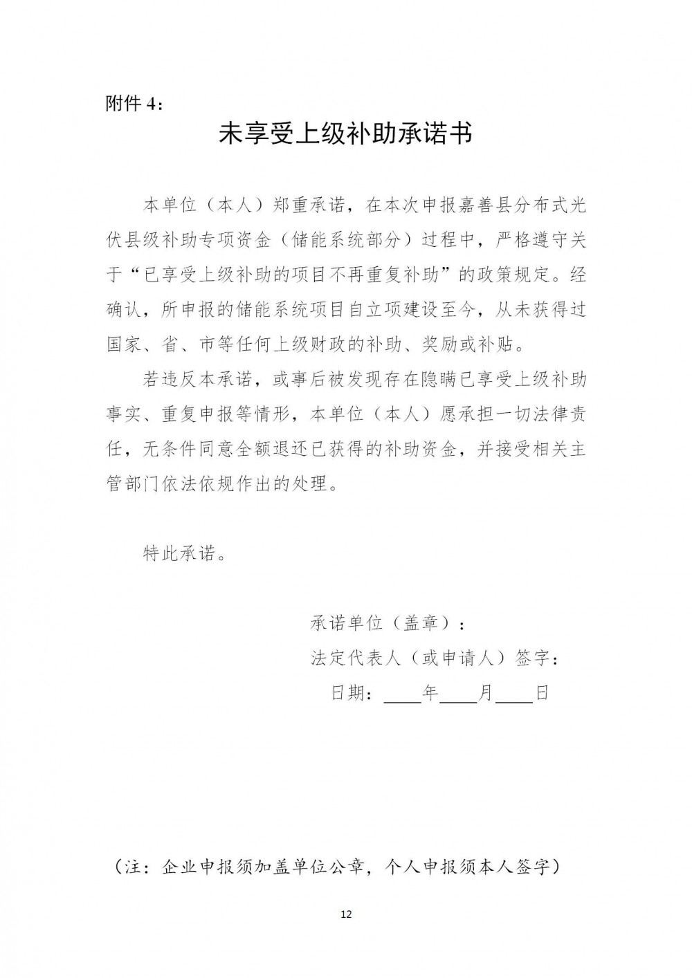 附件:1.各镇(街道)受理地址及咨询电话;2.嘉善县分布式光伏县级补助专项资金申报表;3.申报材料真实性承诺书;4.未享受上级补助承诺书