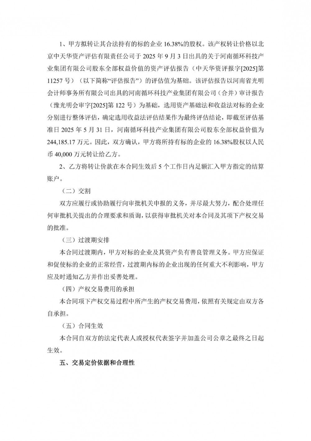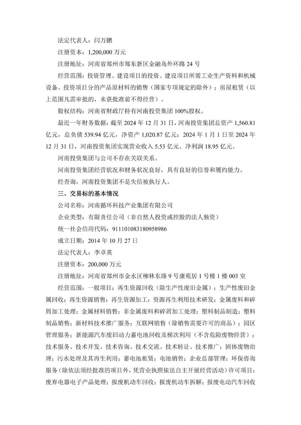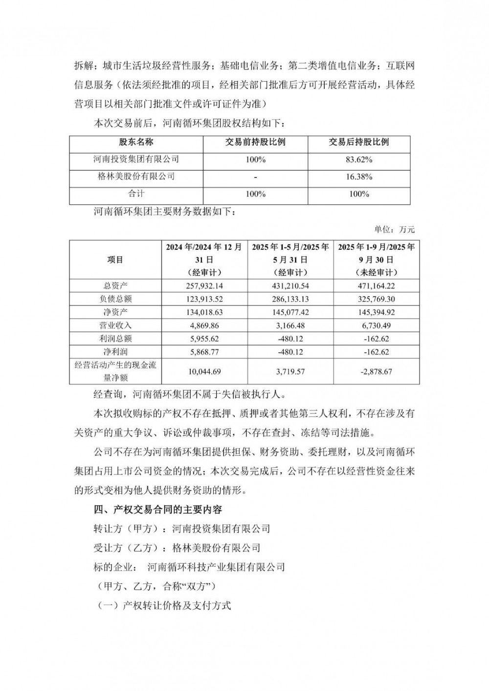近日,格林美发布公告称,为更好地实施格林美股份有限公司循环产业战略布局,促进循环产业的发展,公司决定与具备循环产业发展优势的国有企业实施股权合作。2025年12月12日,公司与河南投资集团有限公司共同签署《产权交易合同》(以下简称“本合同”),公司将收购河南投资集团全资子公司河南循环科技产业集团有限公司16.38%的股权,交易金额为人民币40,000万元。本次交易完成后,河南循环集团将成为公司的参股公司,不纳入公司合并报表范围。