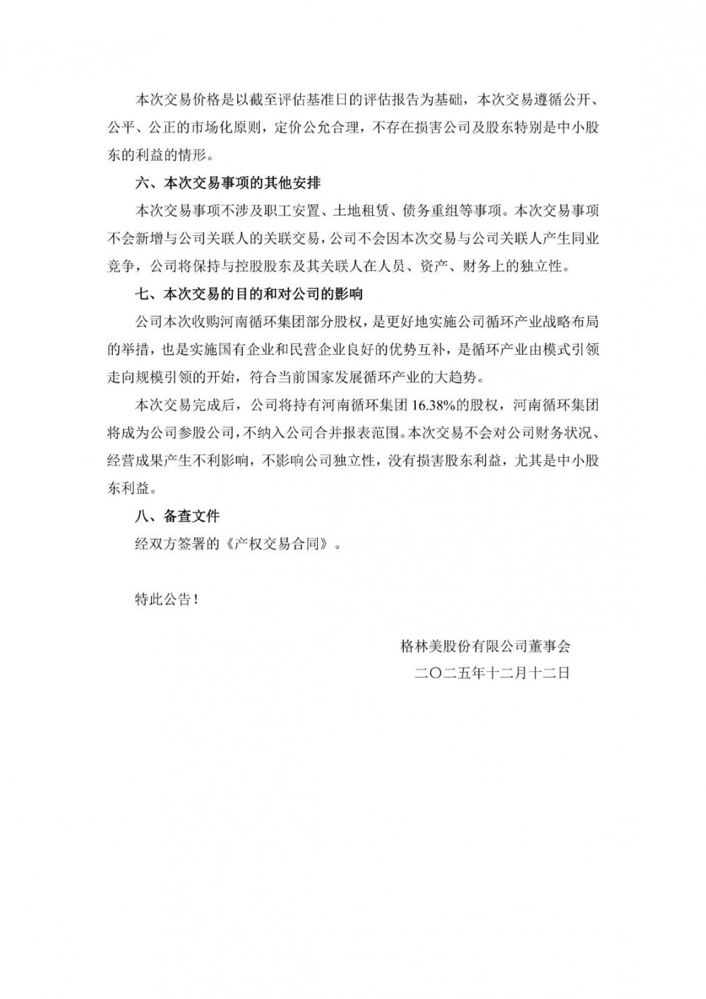 格林美表示,公司本次收购河南循环集团部分股权,是更好地实施公司循环产业战略布局的举措,也是实施国有企业和民营企业良好的优势互补,是循环产业由模式引领走向规模引领的开始,符合当前国家发展循环产业的大趋势。 本次交易完成后,公司将持有河南循环集团 16.38%的股权,河南循环集团将成为公司参股公司,不纳入公司合并报表范围。本次交易不会对公司财务状况、经营成果产生不利影响,不影响公司独立性,没有损害股东利益,尤其是中小股东利益。