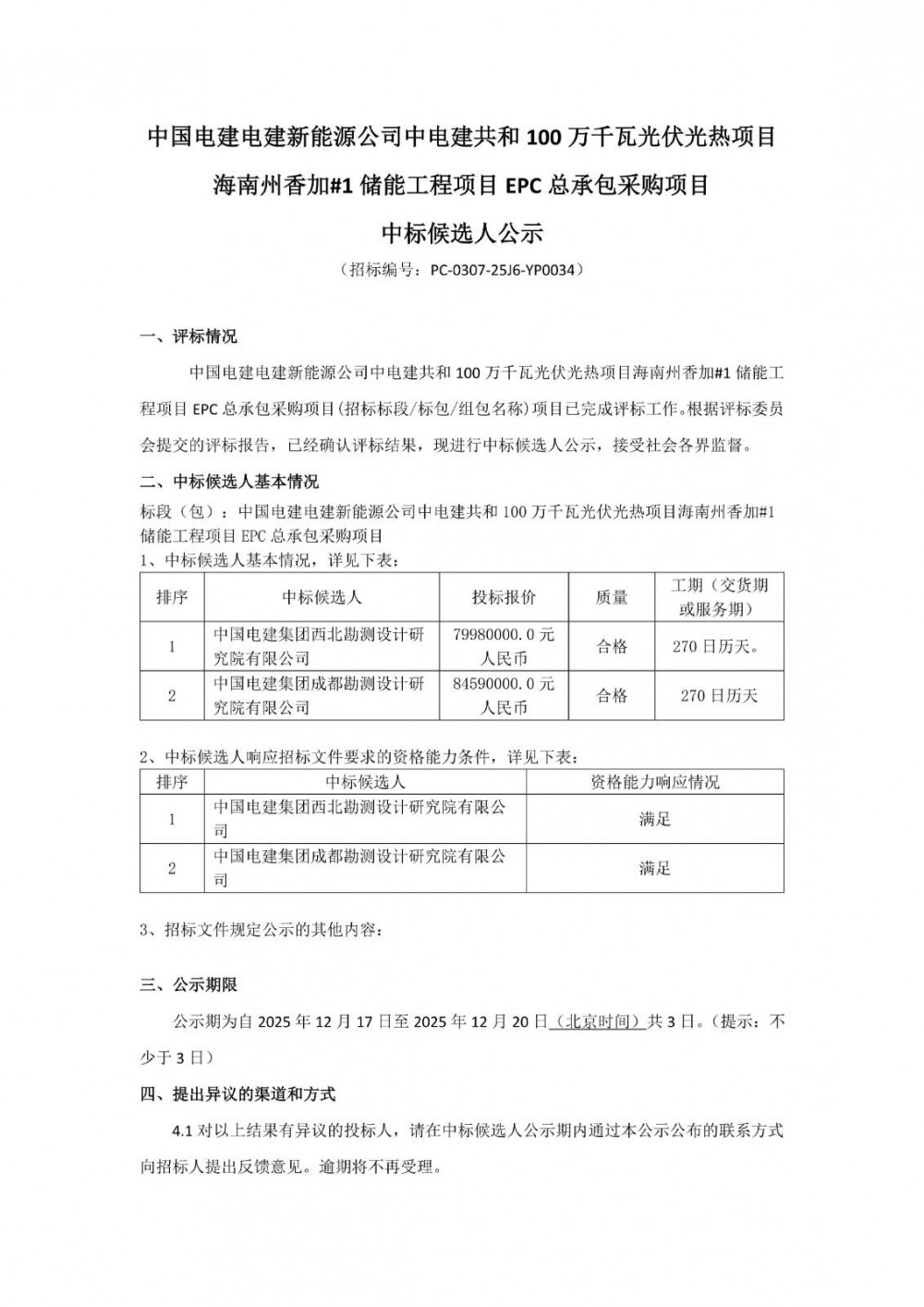 12月17日,中国电建电建新能源公司中电建共和100万千瓦光伏光热项目海南州香加#1储能工程项目EPC总承包采购项目中标候选人公示。