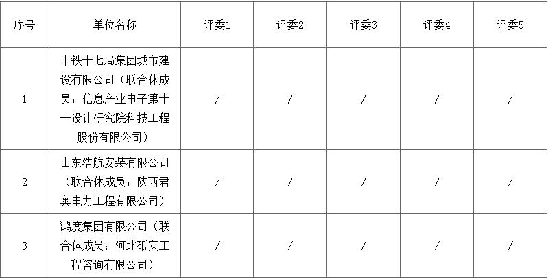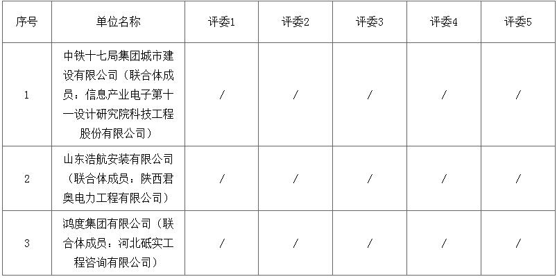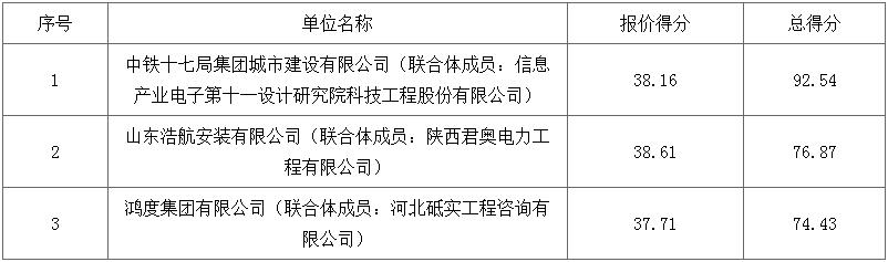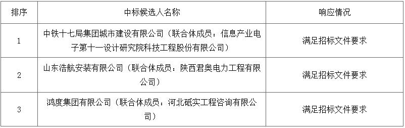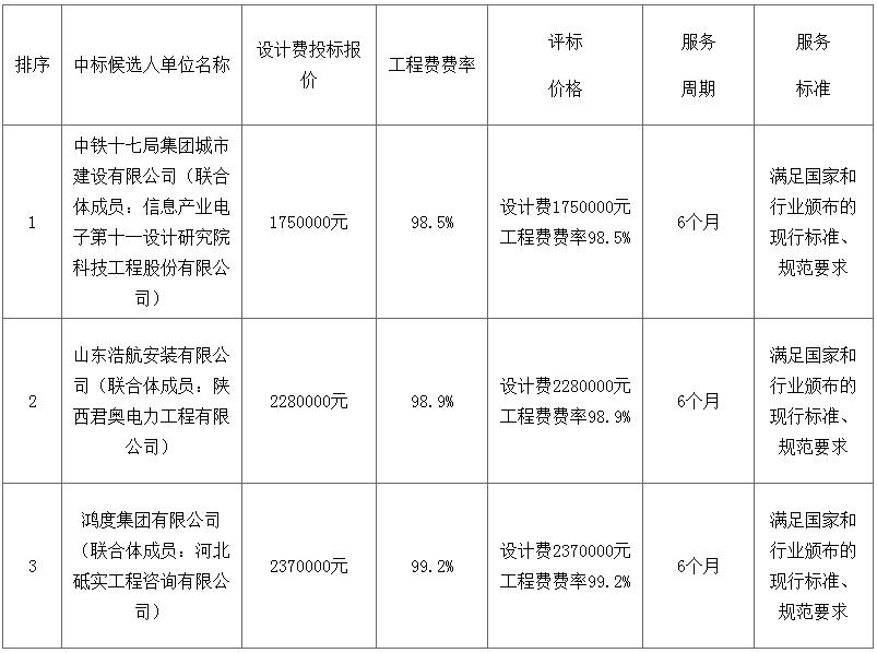 第一中标候选人为中铁十七局集团城市建设有限公司、信息产业电子第十一设计研究院科技工程股份有限公司联合体,设计费投标报价为1750000元,工程费费率为98.5%;第二中标候选人为山东浩航安装有限公司、陕西君奥电力工程有限公司联合体,设计费投标报价为2280000元,工程费费率为98.9%;第三中标候选人为鸿度集团有限公司、河北砥实工程咨询有限公司鸿度集团有限公司联合体,设计费投标报价为2370000元,工程费费率为99.2%。
