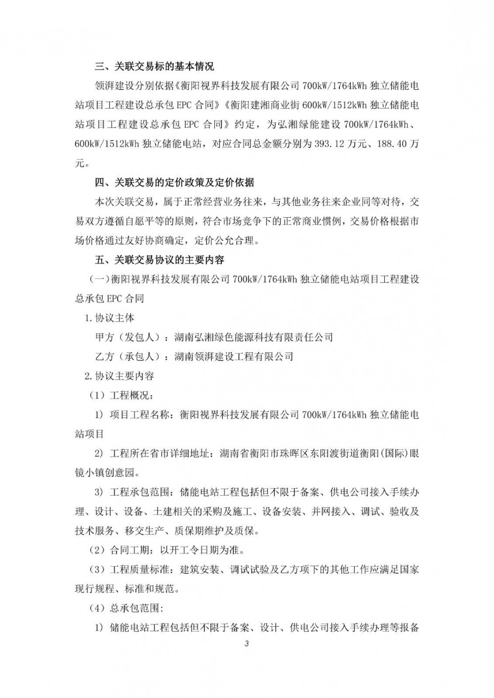 12月17日,领湃科技发布公告称,公司全资孙公司湖南领湃建设工程有限公司拟与湖南弘湘绿色能源科技有限责任公司签署《衡阳视界科技发展有限公司700kW/1764kWh独立储能电站项目工程建设总承包EPC合同》《衡阳建湘商业街600kW/1512kWh独立储能电站项目工程建设总承包EPC合同》,对应合同总金额分别为393.12万元、188.40万元。