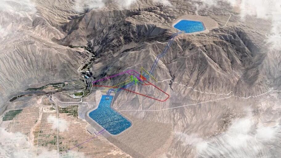 张掖抽水蓄能电站总装机140万千瓦,项目安装4台单机35万千瓦的可逆式水泵水轮发电机组。电站枢纽由上水库、输水系统、地下厂房、开关站、下水库等建筑物组成,为一等大(Ⅰ)型工程。下水库位于黑河出山口左岸盘道山前戈壁滩地,大坝为沥青混凝土面板堆石坝,最大坝高35米,正常蓄水位1745米,调节库容678万立方米。