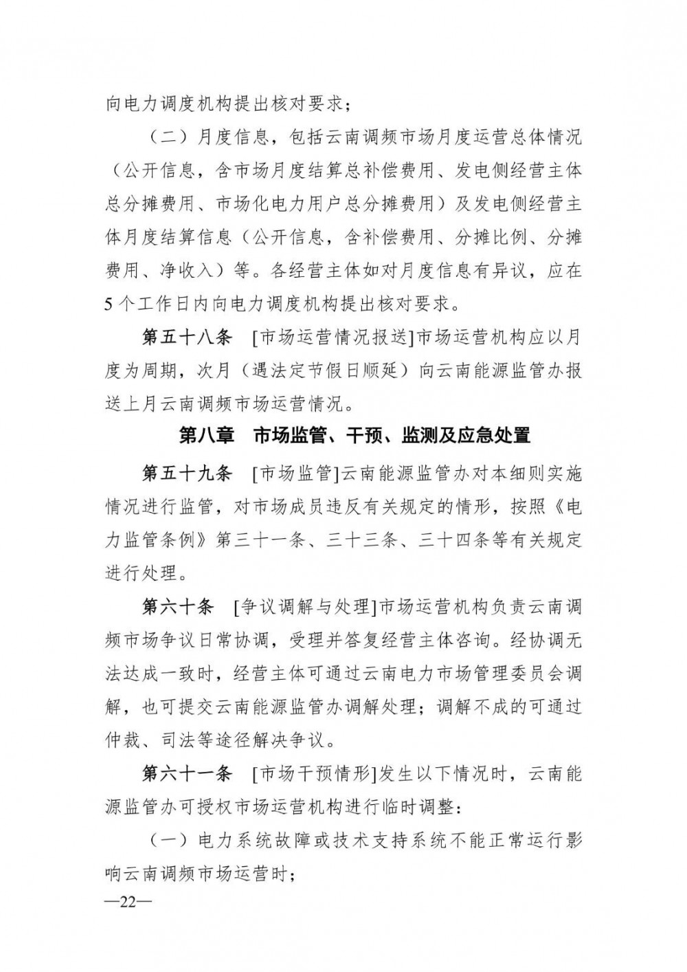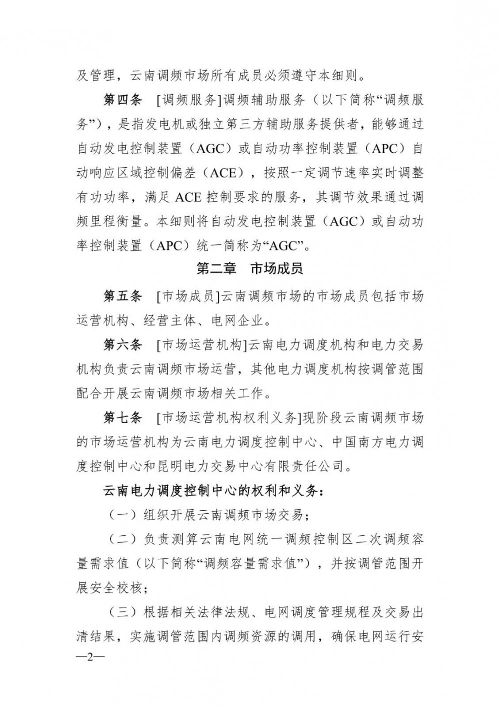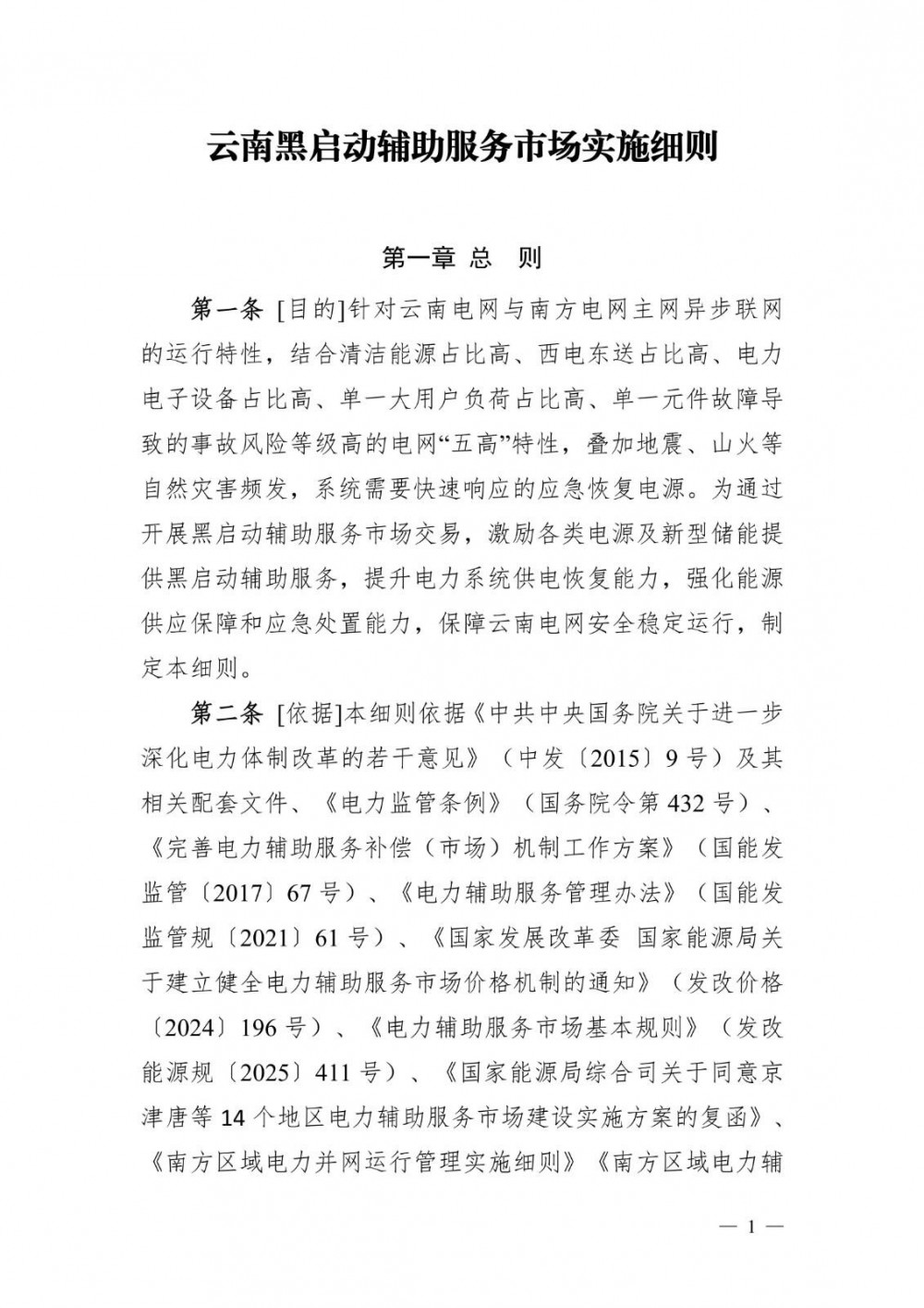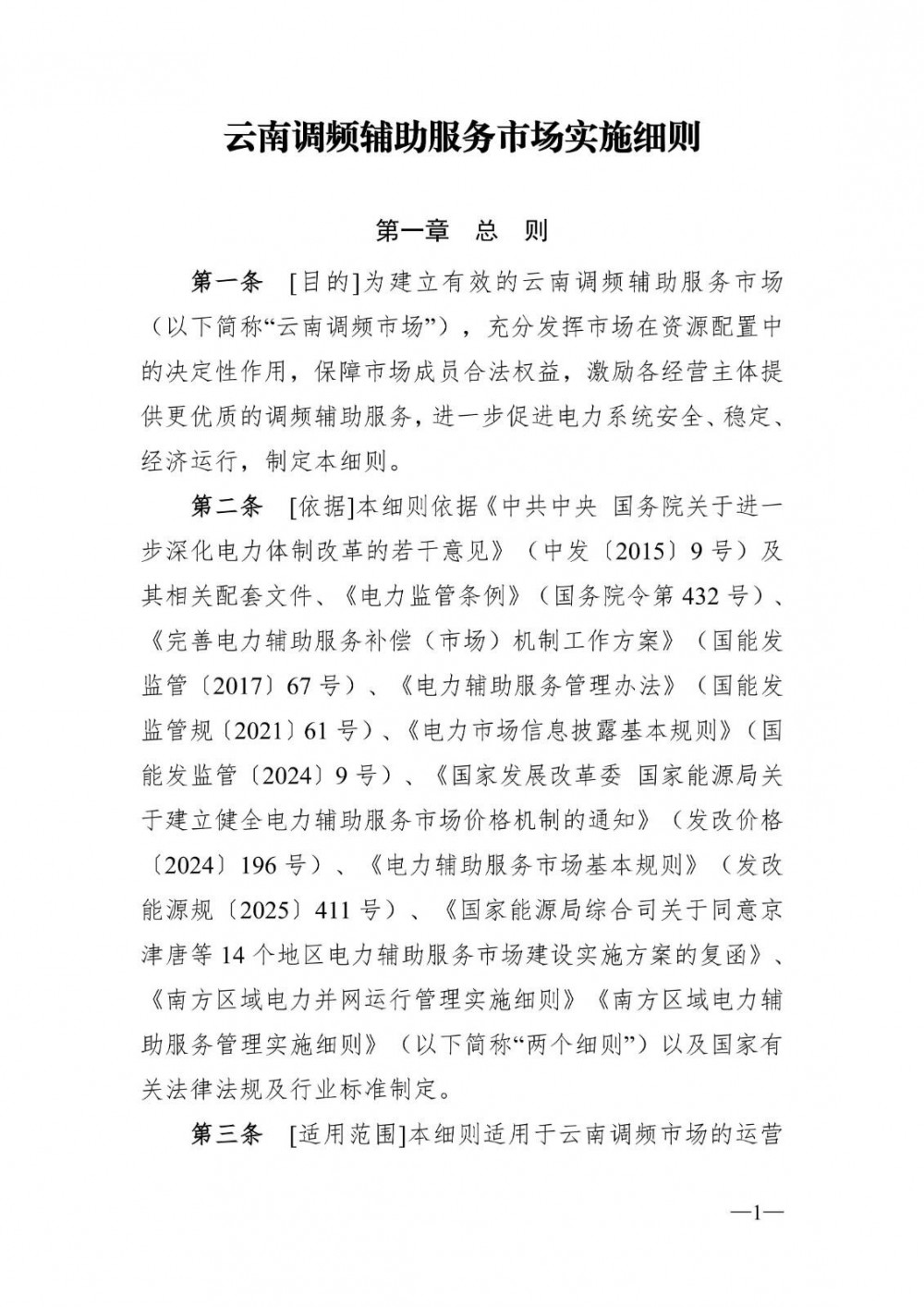 为深入贯彻党中央、国务院重大决策部署,落实国家发展改革委、国家能源局《关于建立健全电力辅助服务市场价格机制的通知》(发改价格〔2024〕196号)、《电力辅助服务市场基本规则》(发改能源规〔2025〕411号)等有关工作要求,持续优化完善电力辅助服务市场相关机制,促进新型电力系统健康有序发展,结合市场运行实际,云南能源监管办会同有关单位组织修编了《云南调频辅助服务市场实施细则》《云南黑启动辅助服务市场实施细则》,现予以印发,并就有关事项通知如下,请一并贯彻执行。