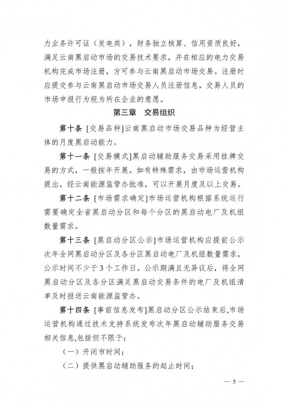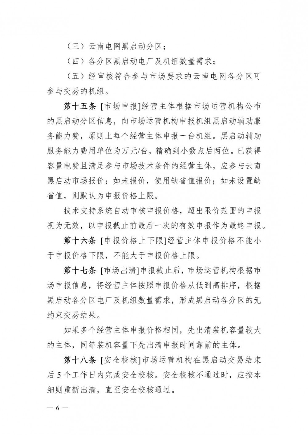 《云南黑启动辅助服务市场实施细则》中提出,黑启动辅助服务交易采用挂牌交易的方式,一般按年开展。市场运营机构根据系统运行需要确定全省黑启动分区和每个分区的黑启动电厂及机组数量需求。已获得容量电费且满足参与市场技术条件的经营主体,应参与云南黑启动市场报价。