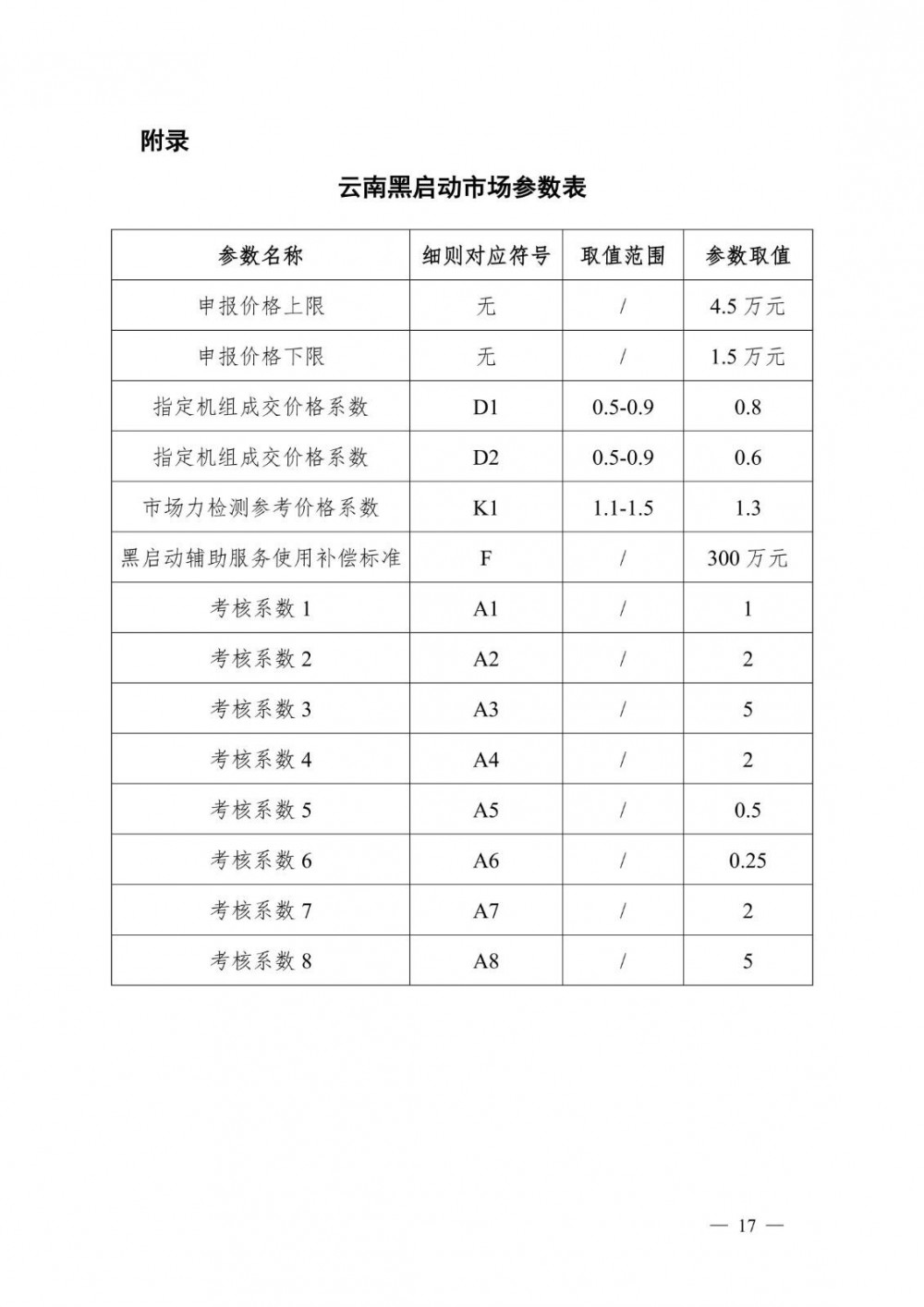 云南黑启动市场参数表明确,申报价格上限4.5万元,申报价格下限1.5万元,黑启动辅助服务使用补偿标准为300万元。