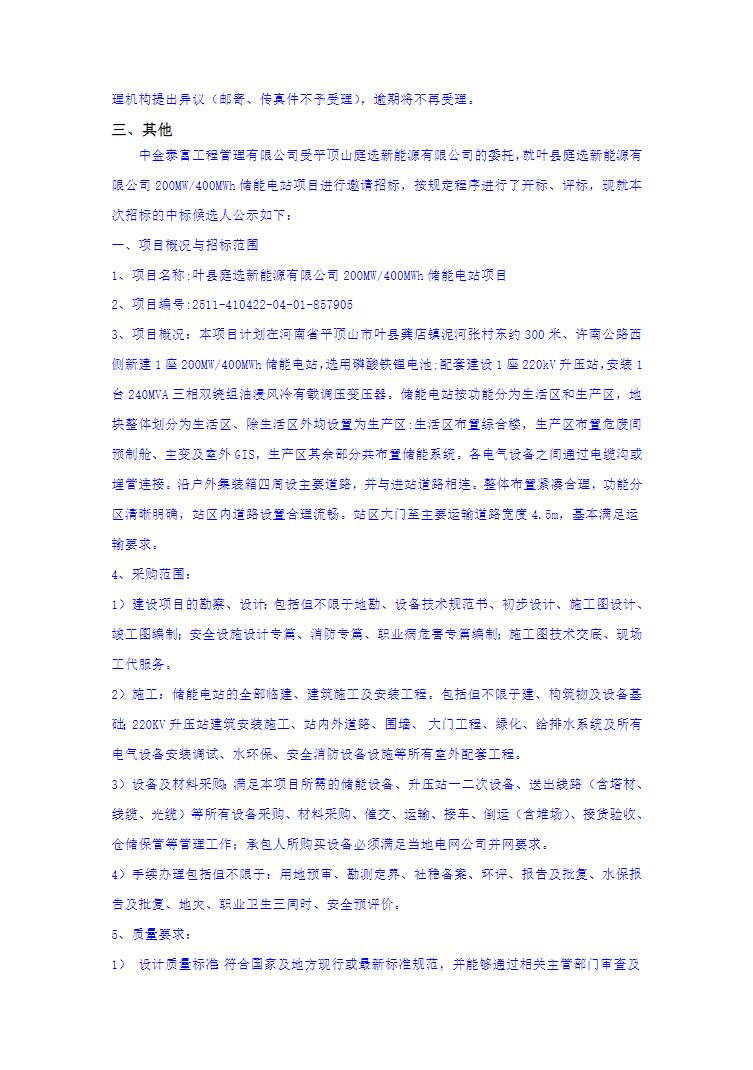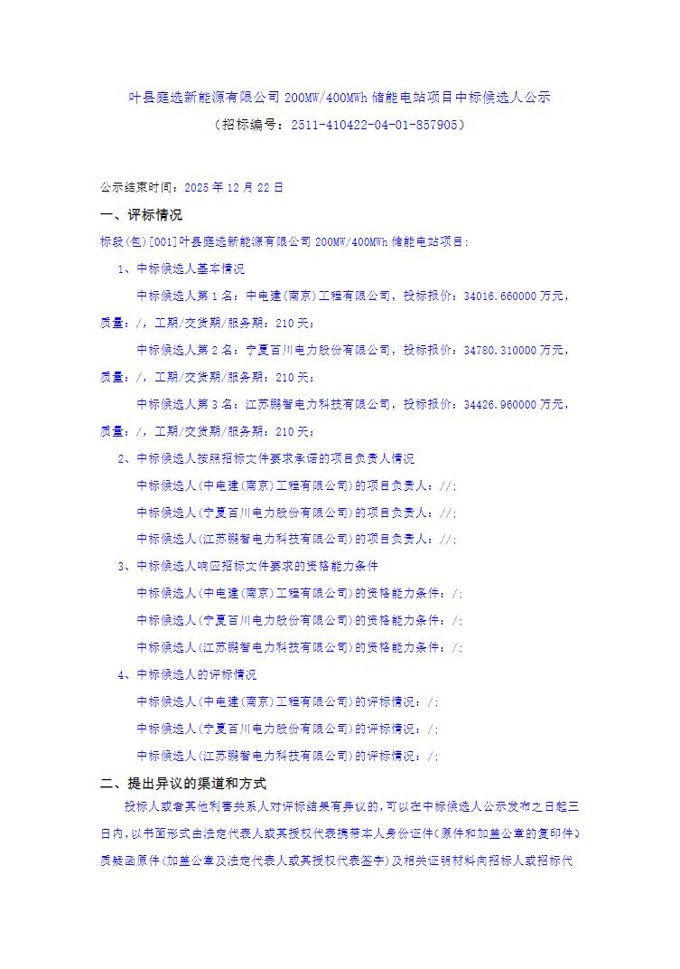 12月18日,叶县庭选新能源有限公司200MW/400MWh储能电站项目中标候选人公示。