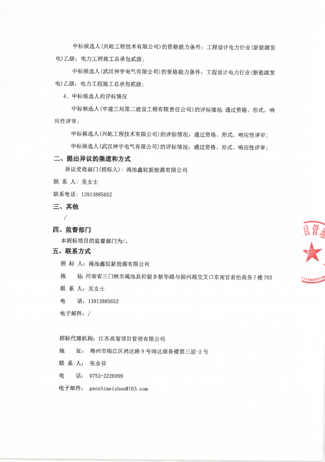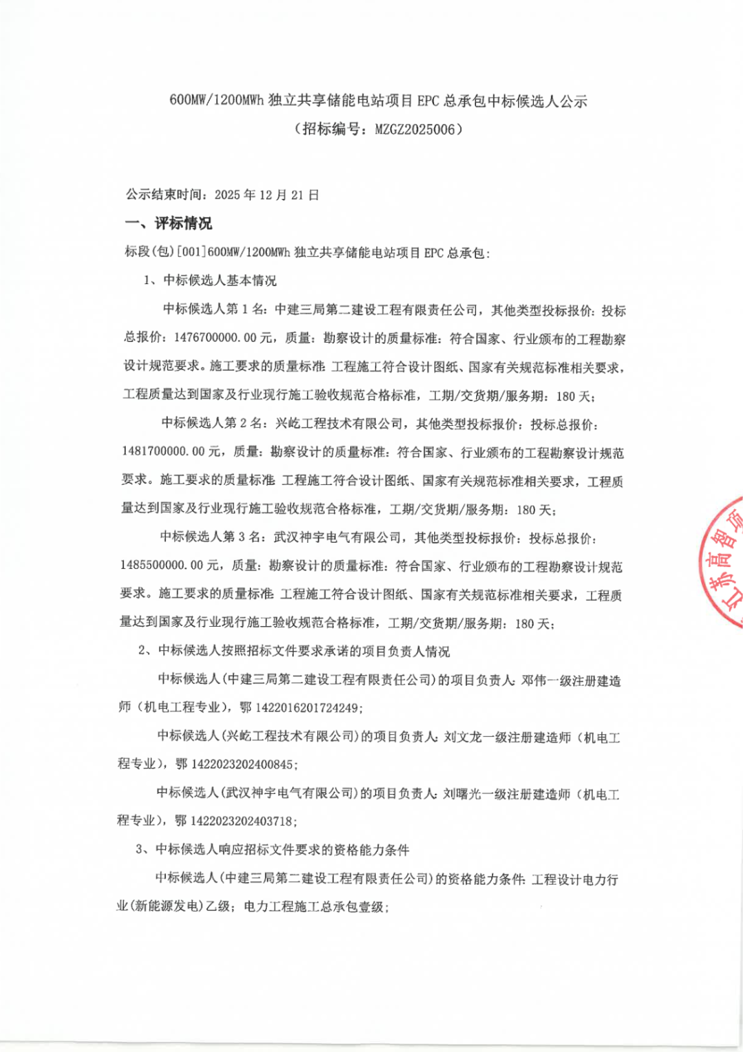 第一中标候选人为中建三局第一建设工程有限责任公司,投标报价为1476700000元,折合单价1.2306元/Wh;第二中标候选人为兴屹工程技术有限公司,投标报价为1481700000元,折合单价1.2348元/Wh;第三中标候选人为武汉神宇电气有限公司,投标报价为1485500000元,折合单价1.2379元/Wh。