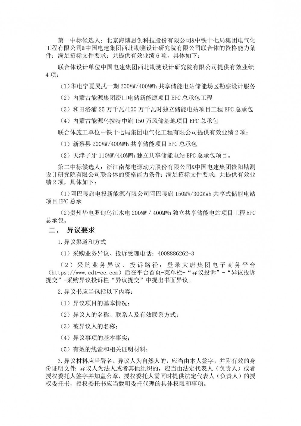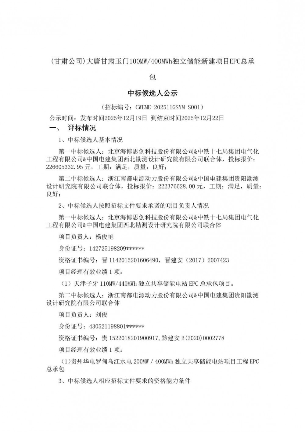 第一中标候选人为北京海博思创科技股份有限公司&中铁十七局集团电气化工程有限公司&中国电建集团西北勘测设计研究院有限公司联合体,投标报价226605332.95元,折合单价0.5665元/Wh;第二中标候选人为浙江南都电源动力股份有限公司&中国电建集团贵阳勘测设计研究院有限公司联合体,投标报价222376628元,折合单价0.5559元/Wh。