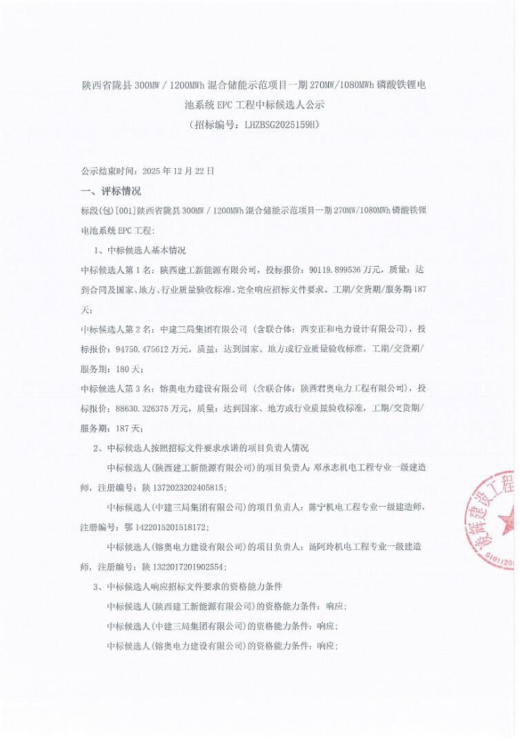 12月19日,陕西省陇县300MW/1200MWh混合储能示范项目一期270MW/1080MWh磷酸铁锂电池系统EPC工程中标候选人公示。