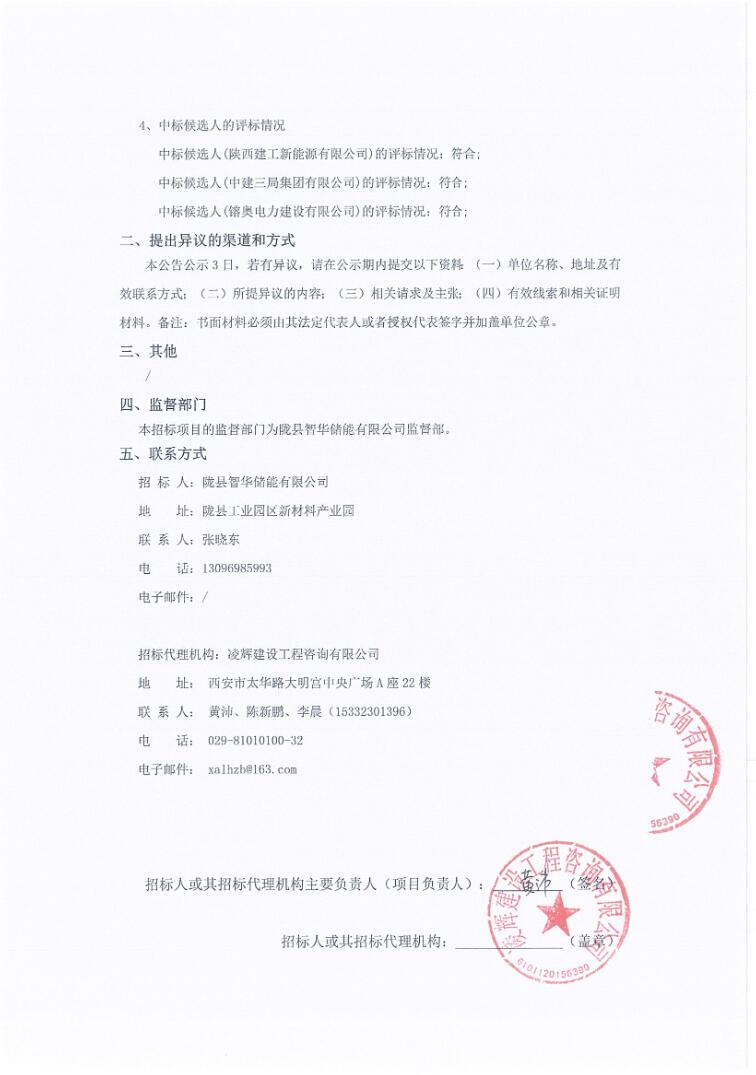 第一中标候选人为陕西建工新能源有限公司,投标报价90119.899536万元,折合单价0.8344元/Wh;第二中标候选人为中建三局集团有限公司、西安正和电力设计有限公司联合体,投标报价94750.475612万元,折合单价0.8773元/Wh;第三中标候选人为镕奥电力建设有限公司、陕西君奥电力工程有限公司联合体,投标报价88630.326375万元,折合单价0.8207元/Wh。