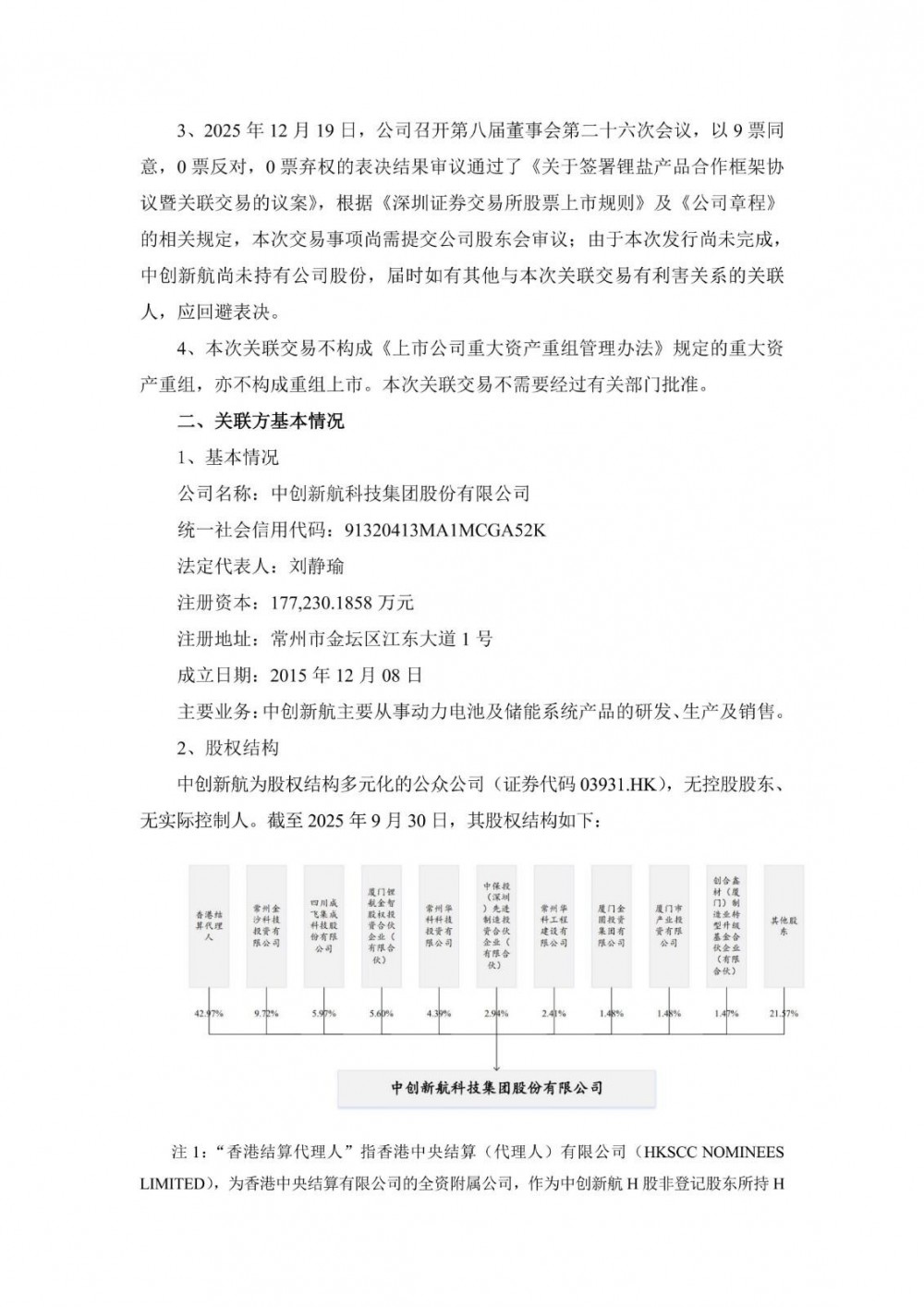 12月19日,盛新锂能发布公告称,公司与中创新航科技集团股份有限公司就锂盐产品业务合作拟签署《2026-2030年合作框架协议》,根据协议约定,中创新航(在该业务合作中,合作双方均包含其指定的子公司)在2026年至2030年期间向公司采购锂盐产品20万吨,具体年度采购量将在双方签订的子订单中进行约定。