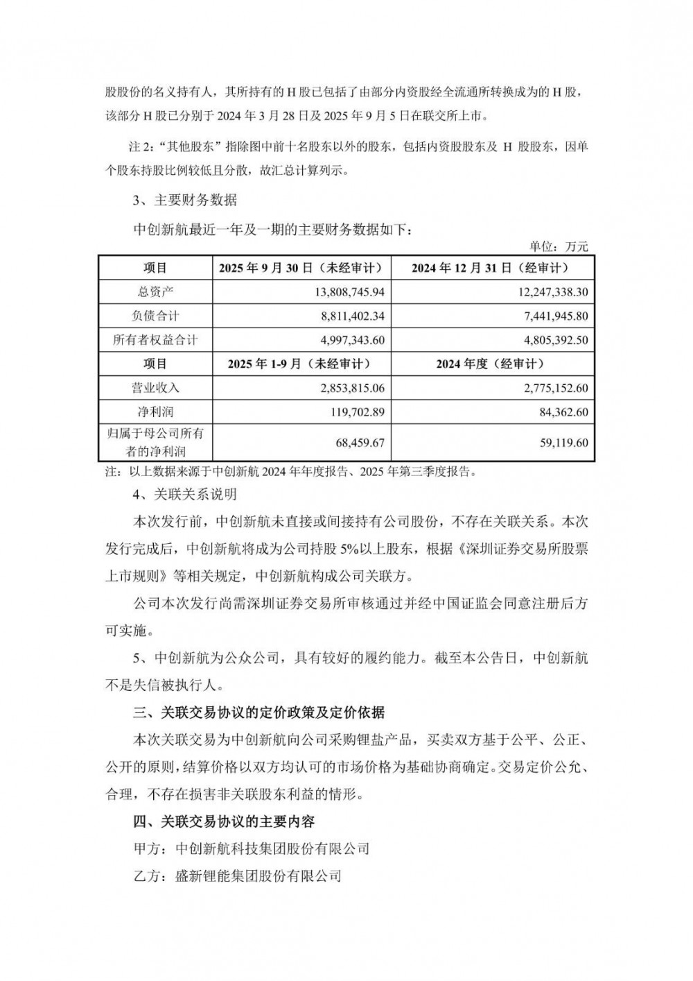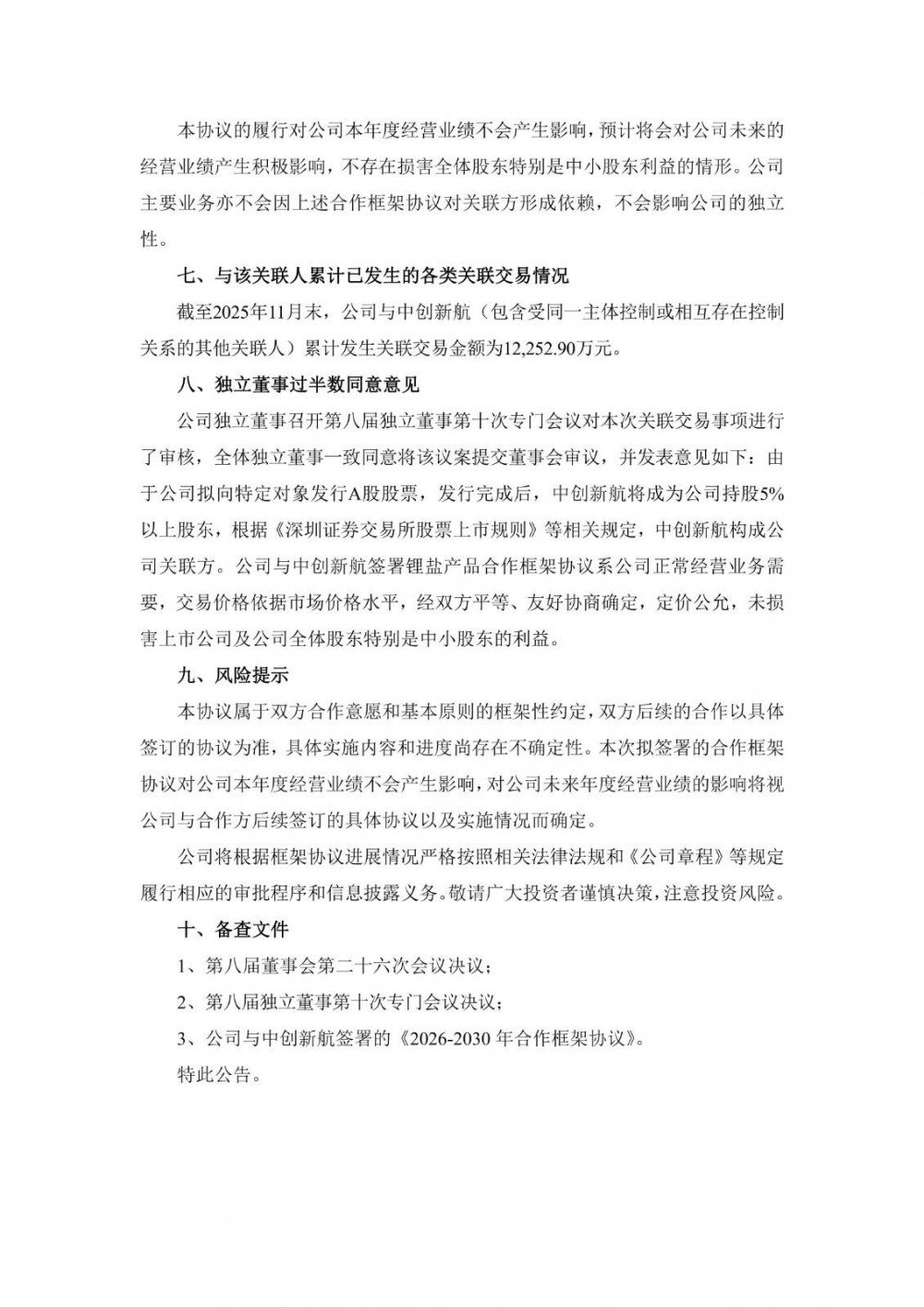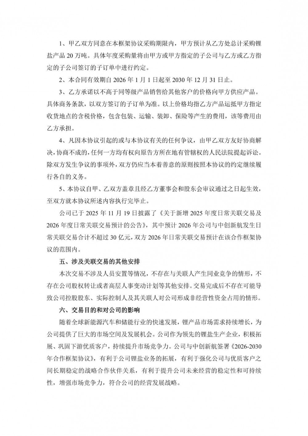 盛新锂能表示,随着全球新能源汽车和储能行业的快速发展,锂产品市场需求持续增长,为公司提供了巨大的市场空间及发展机会。公司作为领先的锂盐生产企业,积极拓展、巩固下游优质客户,持续提升市场竞争力。公司与中创新航签署《2026-2030年合作框架协议》,有利于公司锂盐业务的拓展,有利于强化公司与优质客户之间长期稳定的战略合作伙伴关系,有利于提升公司未来经营的稳定性和可持续性,增强市场竞争力,符合公司的经营发展战略。
