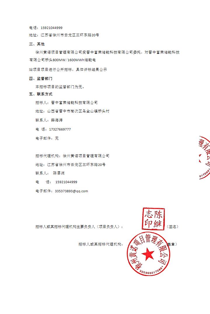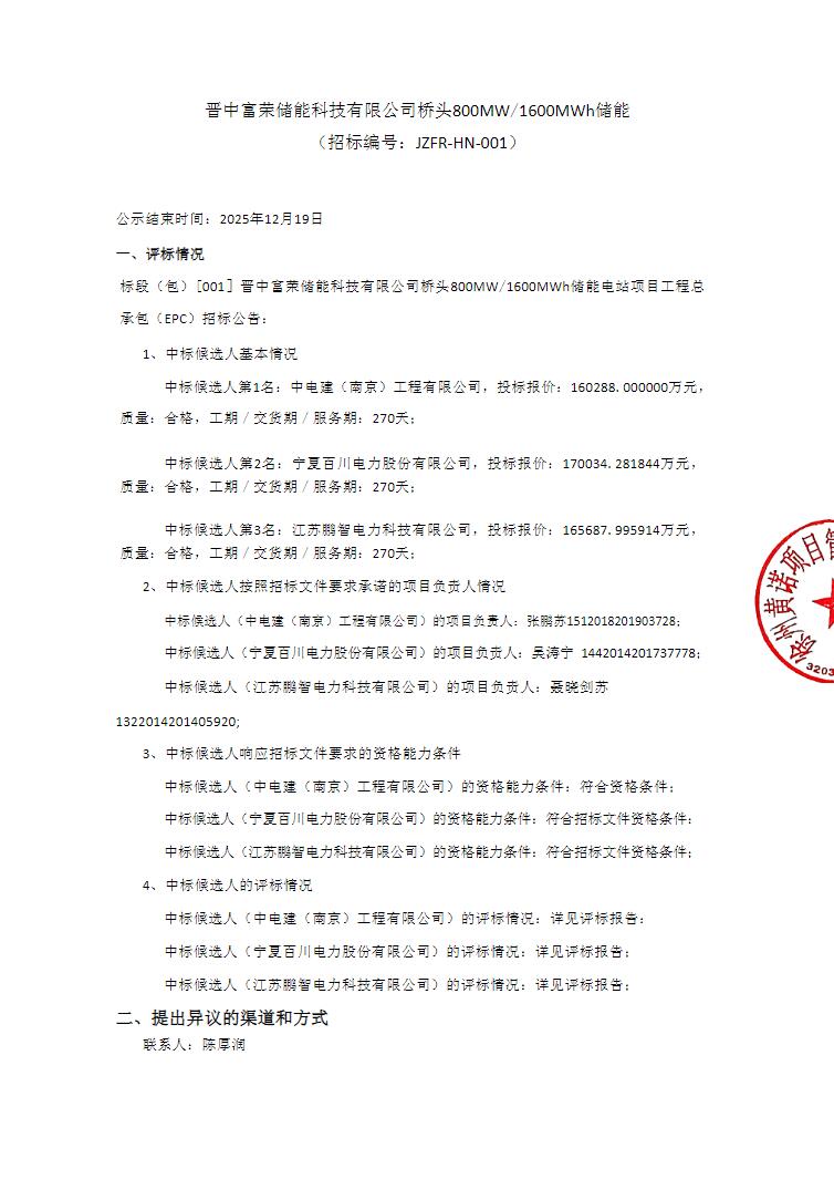 近日,晋中富荣储能科技有限公司桥头800MW/1600MWh储能电站项目工程总承包(EPC)中标候选人公示。