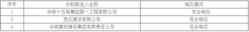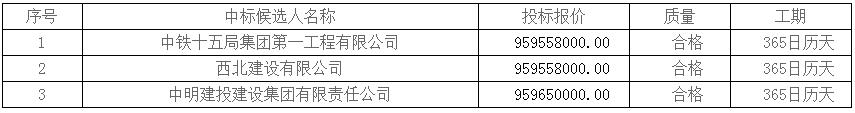 第一中标候选人为中铁十五局集团第一工程有限公司,投标报价为959558000元,折合单价0.7996元/Wh;第二中标候选人为西北建设有限公司,投标报价为959558000元,折合单价0.7996元/Wh;第三中标候选人为中明建投建设集团有限责任公司,投标报价为959650000元,折合单价0.7997元/Wh。