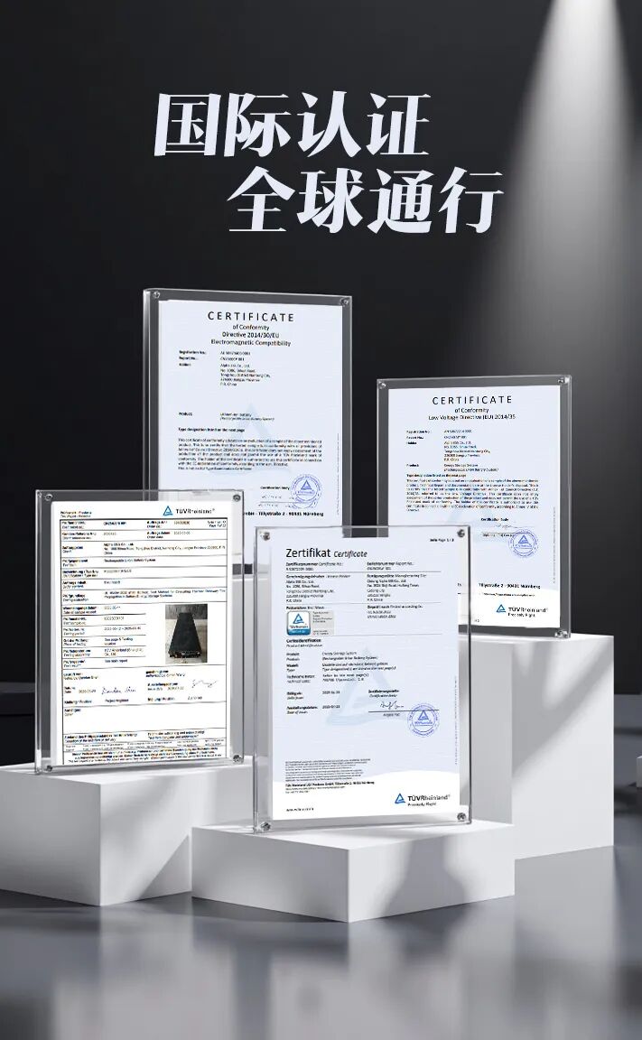 在质量认证方面,该系统已通过多项国际权威认证,覆盖电池安全、系统性能、电磁兼容及火灾防控四大核心维度。产品满足IEC 62619、IEC 62477、IEC 61000、IEC 62933、UL 1973、UL 9540A、NFPA 69等国际标准,充分满足当地市场对产品安全与性能的严苛准入要求。