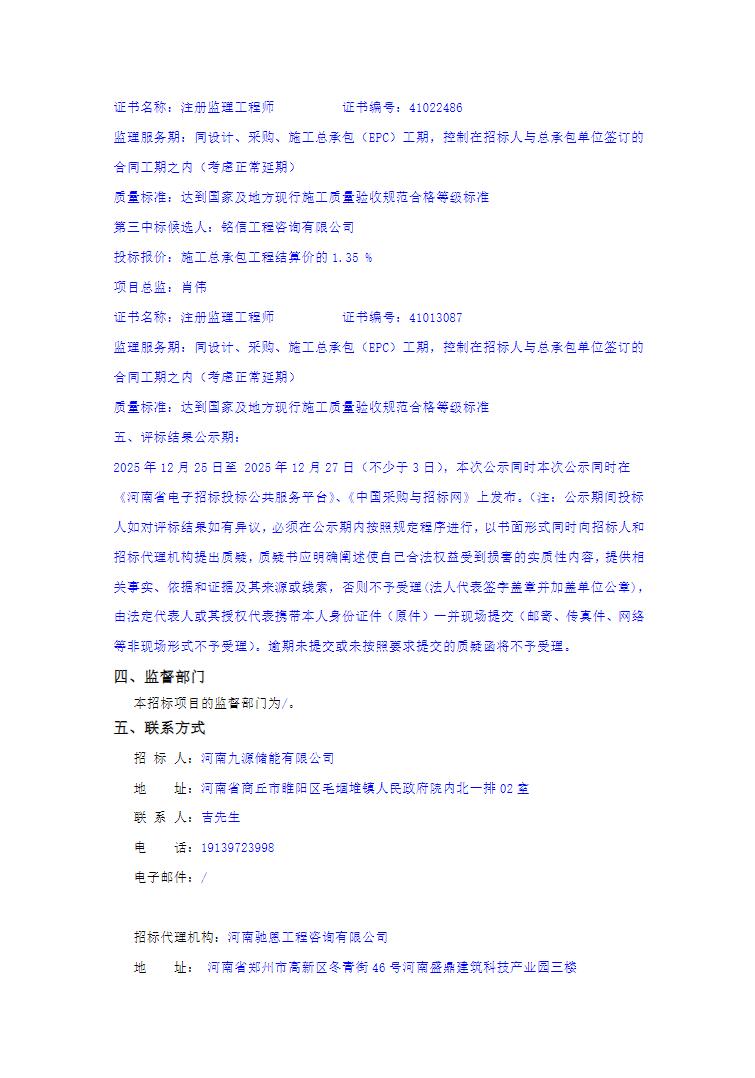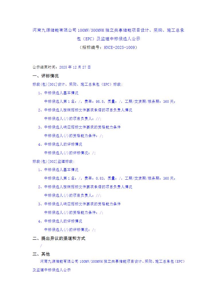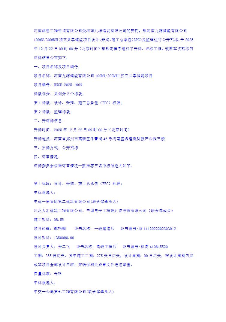 12月24日,河南九源储能有限公司100MW/300MWH独立共享储能项目设计、采购、施工总承包(EPC)中标候选人公示。