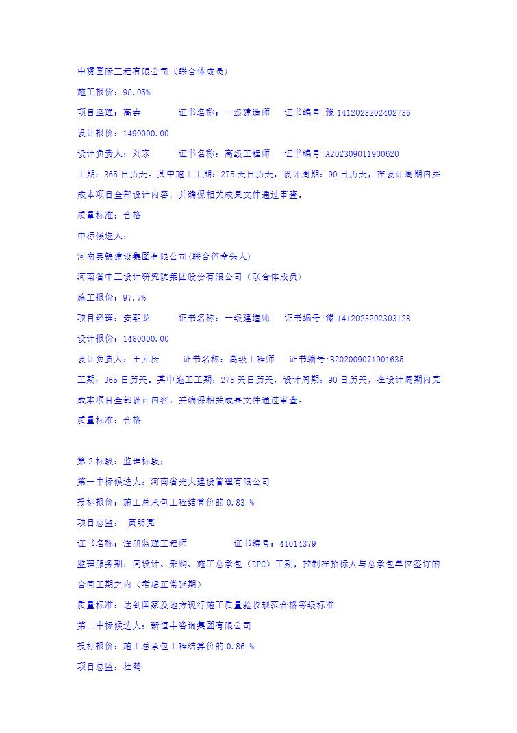 第一中标候选人为中建一局集团第二建筑有限公司、河北人汇建筑工程有限公司、中国电子工程设计院股份有限公司联合体,设计报价为1380000元;第二中标候选人为中交一公局第七工程有限公司、中赟国际工程有限公司联合体,设计报价为1490000元;第三中标候选人为河南昊锦建设集团有限公司、河南省中工设计研究院集团股份有限公司联合体,设计报价为1480000元。