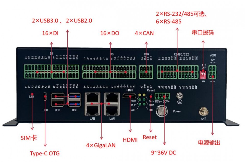I/O 资源也十分丰富,16 路数字量输入(DI)和 16 路数字量输出(DO)接口,支持多种输出方式,灵活应对各种控制场景;2 路 RS-232/485 可选串口和 6 路 RS-485 串口增强了通信能力和兼容性,满足多元应用需求。