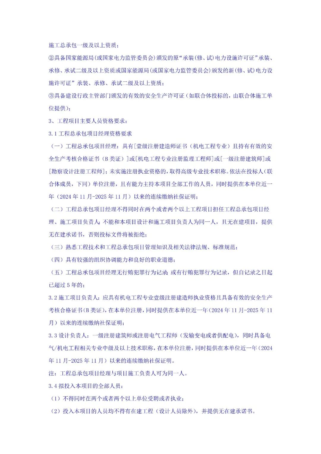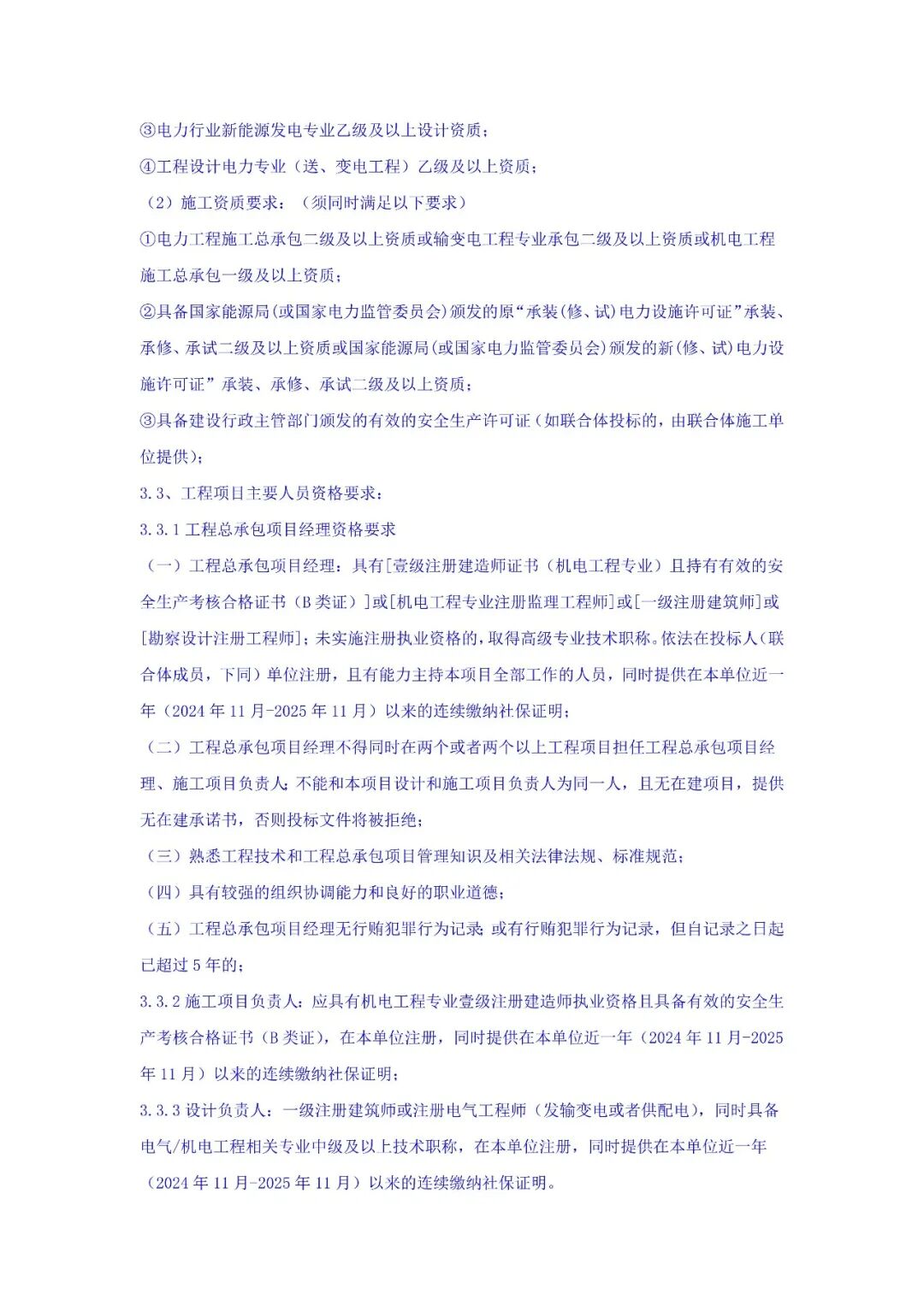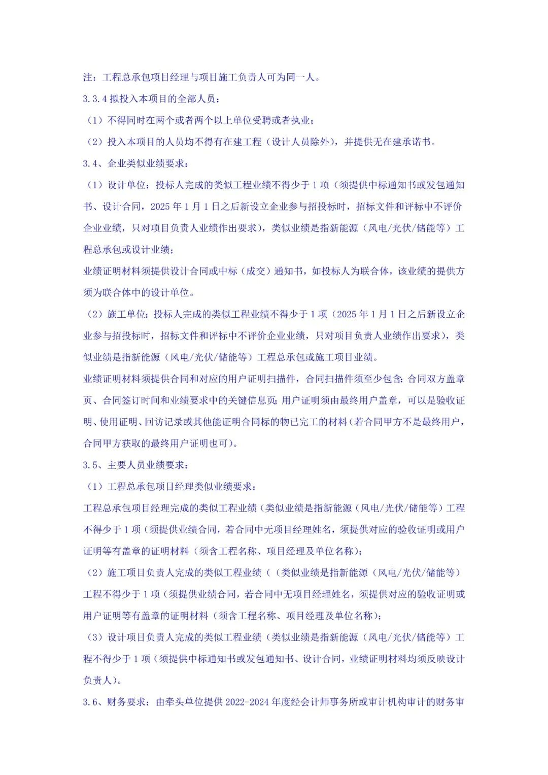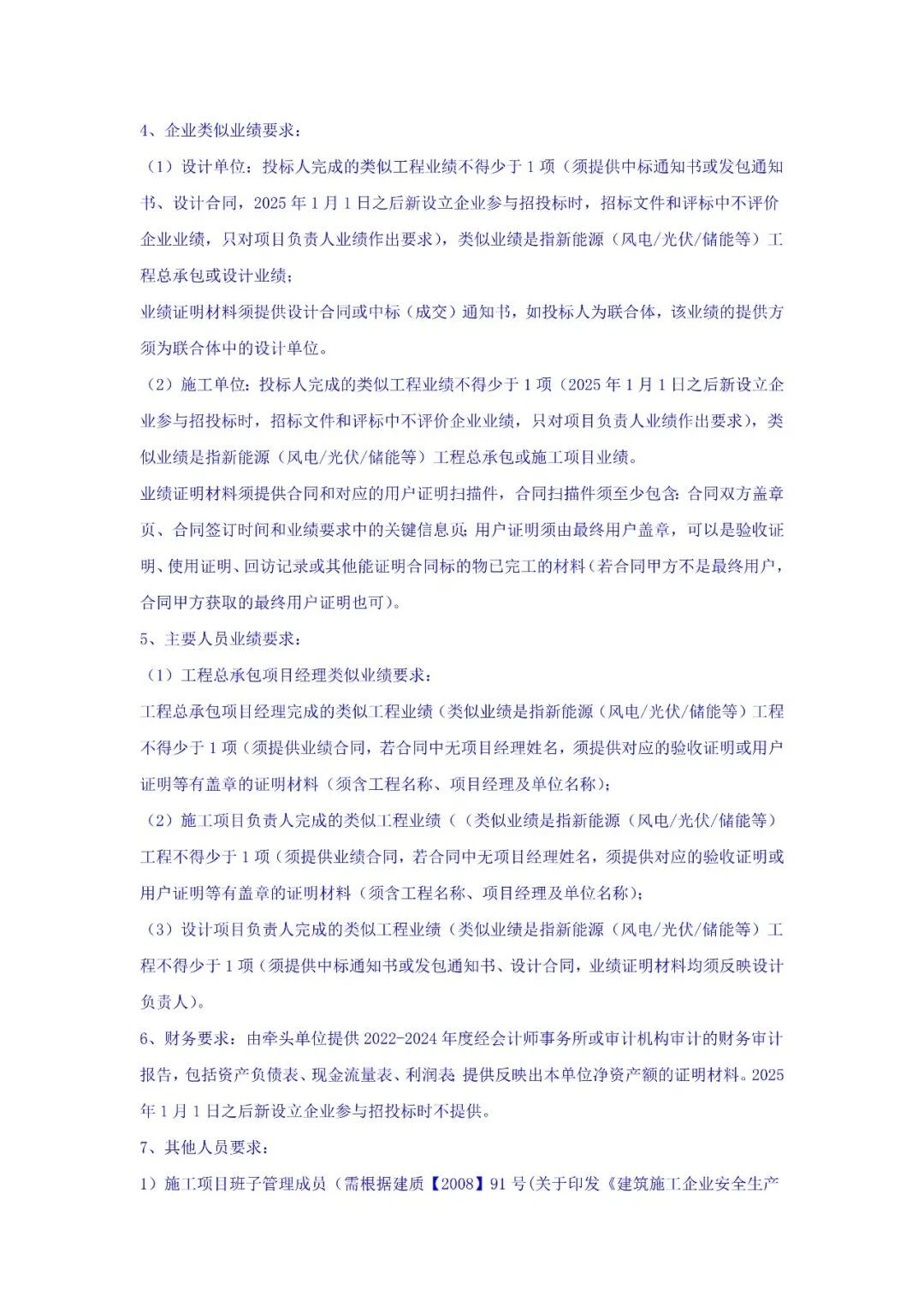 (1)设计单位:投标人完成的类似工程业绩不得少于1项(须提供中标通知书或发包通知书、设计合同,2025年1月1日之后新设立企业参与招投标时,招标文件和评标中不评价企业业绩,只对项目负责人业绩作出要求),类似业绩是指新能源(风电/光伏/储能等)工程总承包或设计业绩。