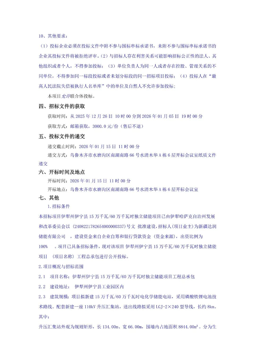 项目招标人为新疆达润储能有限公司,工程投资额约60155.04万元,折合单价1.0026元/Wh。