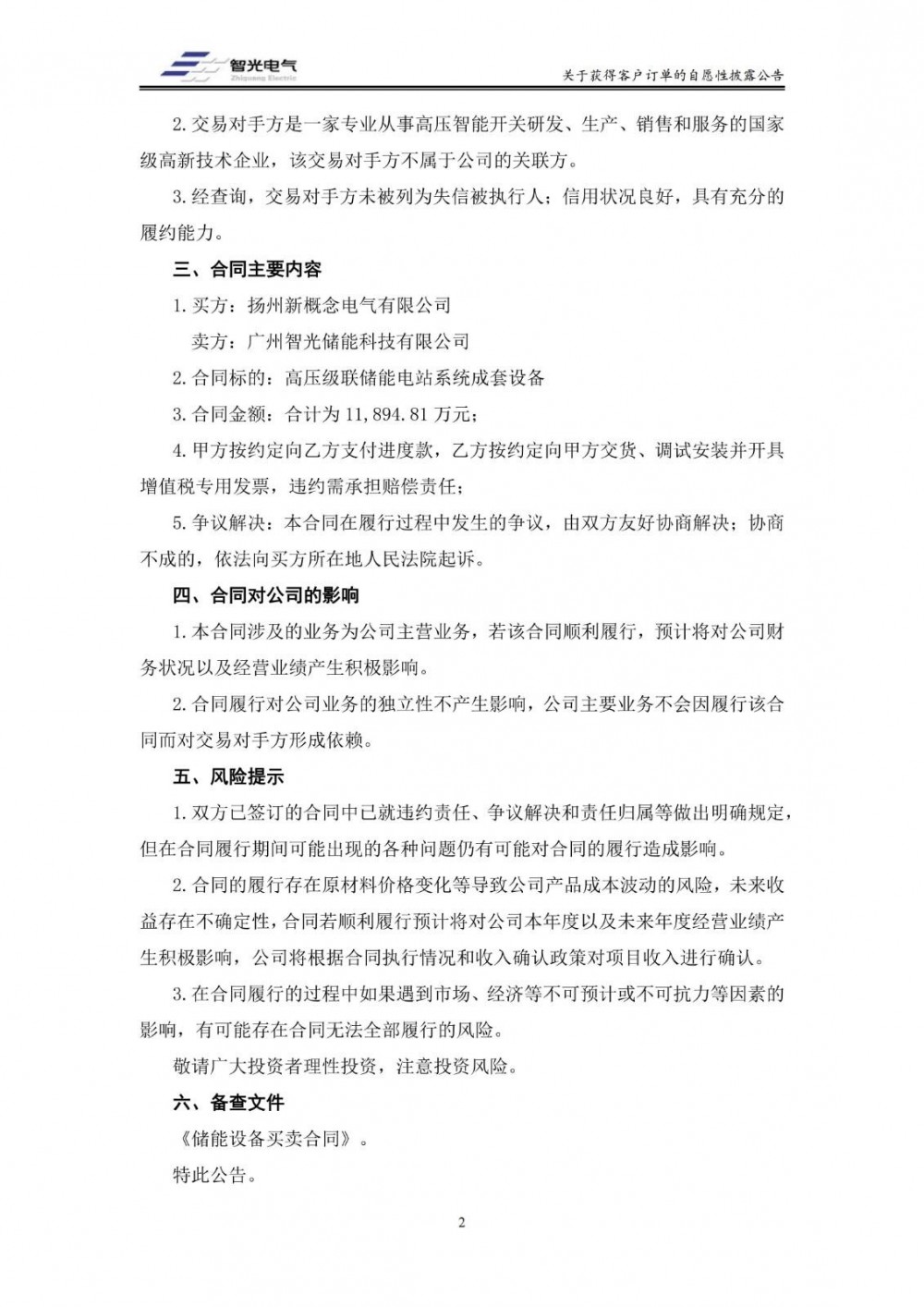 12月26日,智光电气发布公告称,公司控股子公司广州智光储能科技有限公司于近日与扬州新概念电气有限公司签订了金额合计为人民币11,894.81万元的《买卖合同》,买方向智光储能购买高压级联储能系统。