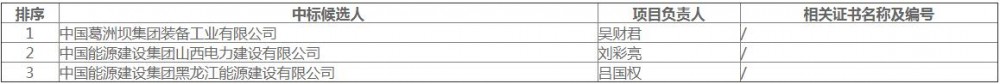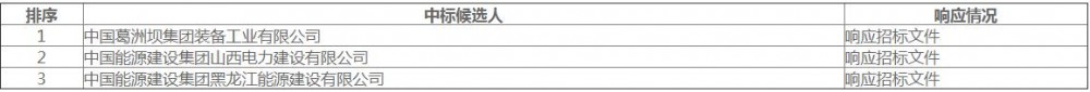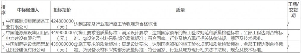 第一中标候选人为中国葛洲坝集团装备工业有限公司,投标报价为424800000元,折合单价0.708元/Wh;第二中标候选人为中国能源建设集团山西电力建设有限公司,投标报价为449900000元,折合单价0.7498元/Wh;第三中标候选人为中国能源建设集团黑龙江能源建设有限公司,投标报价为439000000元,折合单价0.7317元/Wh。