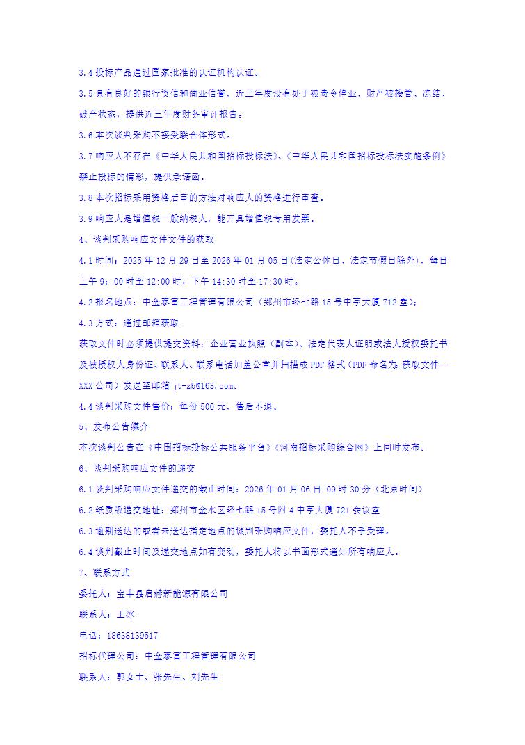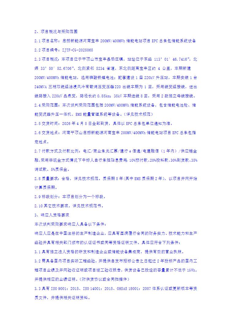 12月26日,启赫新能源河南宝丰200MW/400MWh储能电站项目EPC总承包储能系统设备谈判采购公告发布。