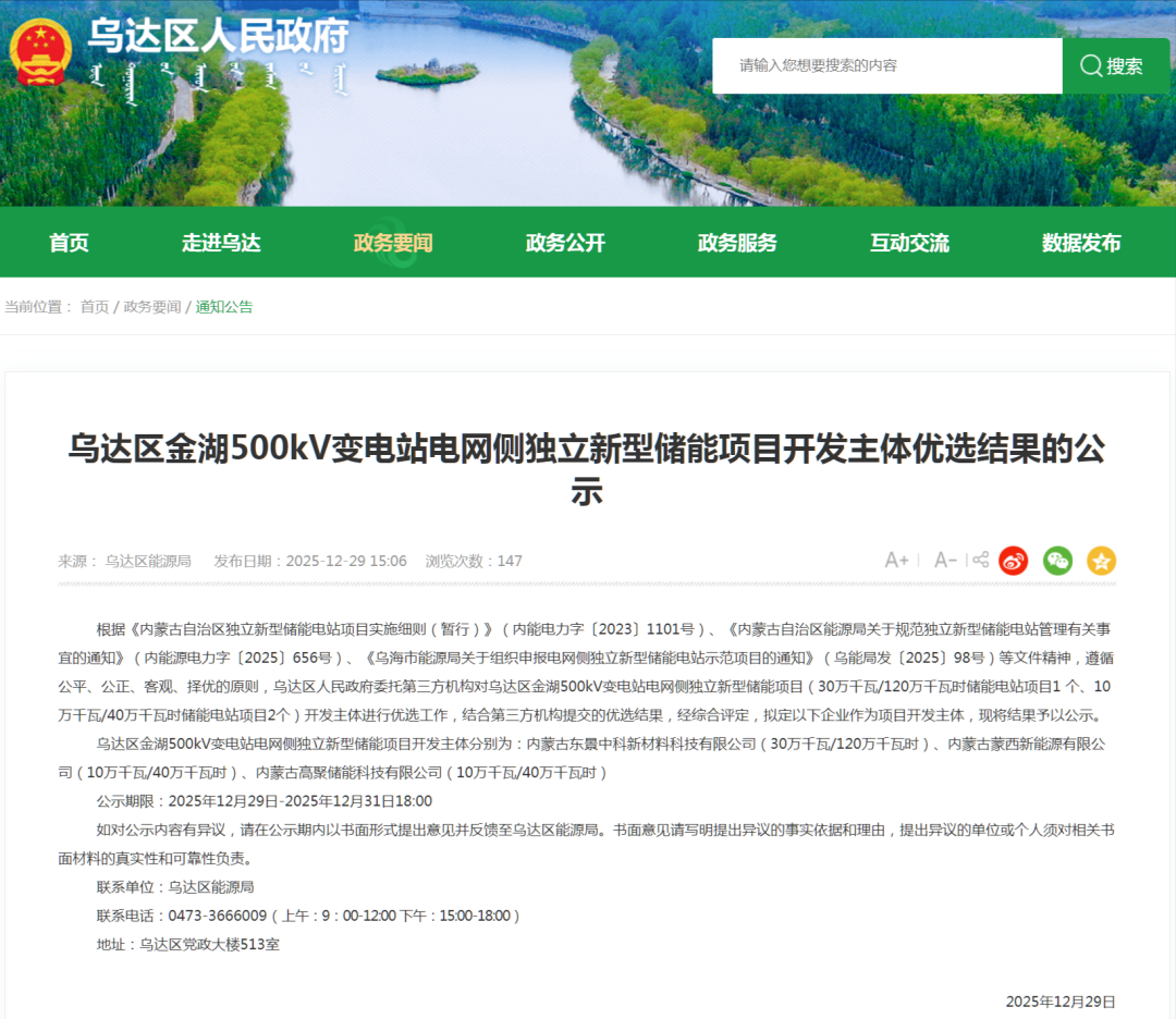 根据《内蒙古自治区独立新型储能电站项目实施细则(暂行)》(内能电力字〔2023〕1101号)、《内蒙古自治区能源局关于规范独立新型储能电站管理有关事宜的通知》(内能源电力字〔2025〕656号)、《乌海市能源局关于组织申报电网侧独立新型储能电站示范项目的通知》(乌能局发〔2025〕98号)等文件精神,遵循公平、公正、客观、择优的原则,乌达区人民政府委托第三方机构对乌达区金湖500kV变电站电网侧独立新型储能项目(30万千瓦/120万千瓦时储能电站项目1 个、10万千瓦/40万千瓦时储能电站项目2个)开发主体进行优选工作,结合第三方机构提交的优选结果,经综合评定,拟定以下企业作为项目开发主体,现将结果予以公示。