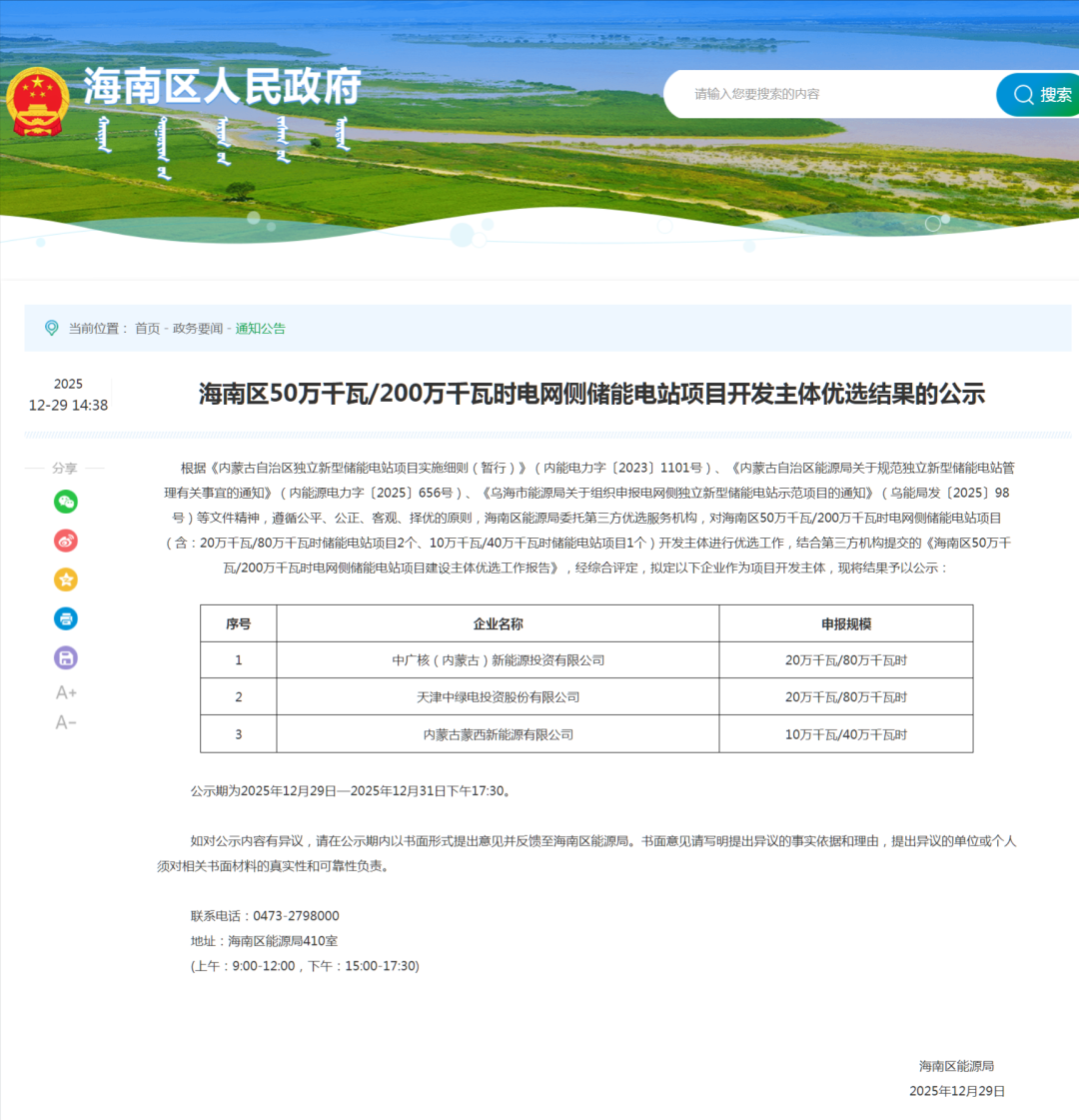 根据《内蒙古自治区独立新型储能电站项目实施细则(暂行)》(内能电力字〔2023〕1101号)、《内蒙古自治区能源局关于规范独立新型储能电站管理有关事宜的通知》(内能源电力字〔2025〕656号)、《乌海市能源局关于组织申报电网侧独立新型储能电站示范项目的通知》(乌能局发〔2025〕98号)等文件精神,遵循公平、公正、客观、择优的原则,海南区能源局委托第三方优选服务机构,对海南区50万千瓦/200万千瓦时电网侧储能电站项目(含:20万千瓦/80万千瓦时储能电站项目2个、10万千瓦/40万千瓦时储能电站项目1个)开发主体进行优选工作,结合第三方机构提交的《海南区50万千瓦/200万千瓦时电网侧储能电站项目建设主体优选工作报告》,经综合评定,拟定以下企业作为项目开发主体,现将结果予以公示: