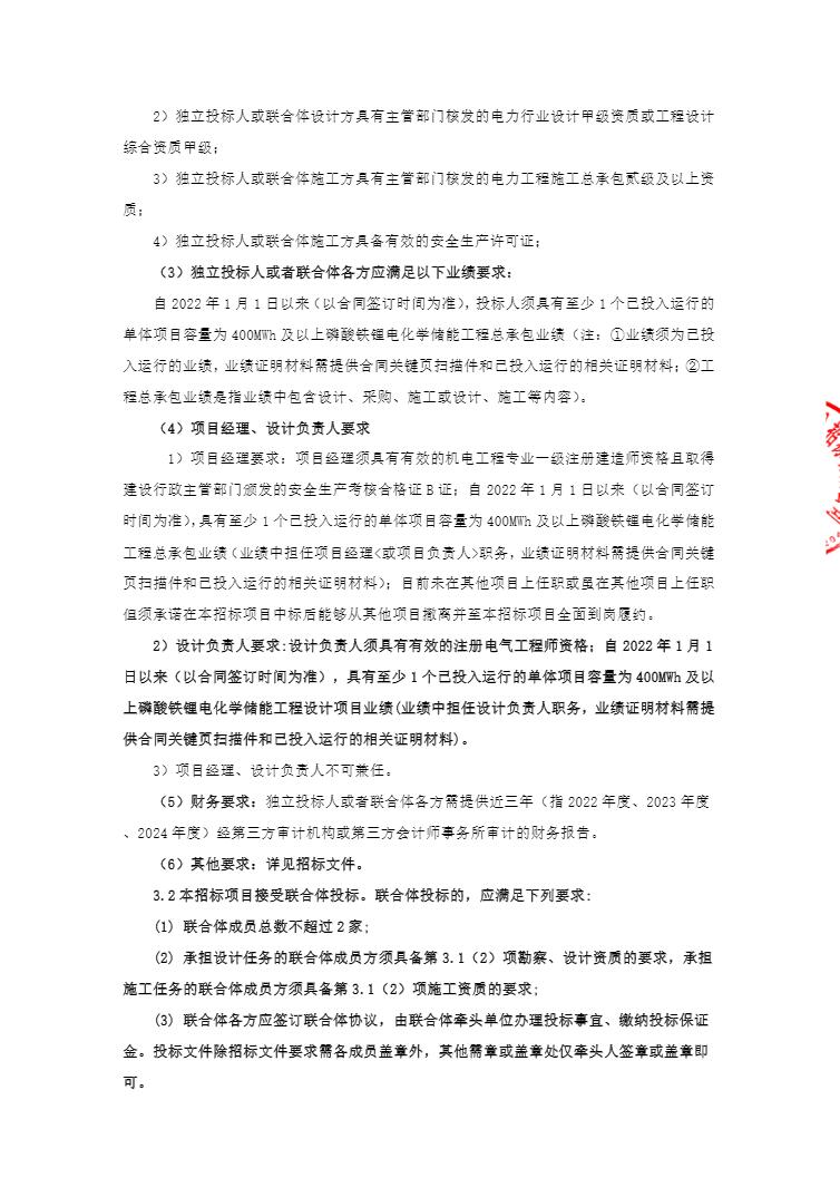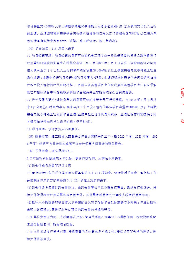 自2022年1月1日以来(以合同签订时间为准),投标人须具有至少1个已投入运行的单体项目容量为400MWh及以上磷酸铁锂电化学储能工程总承包业绩。