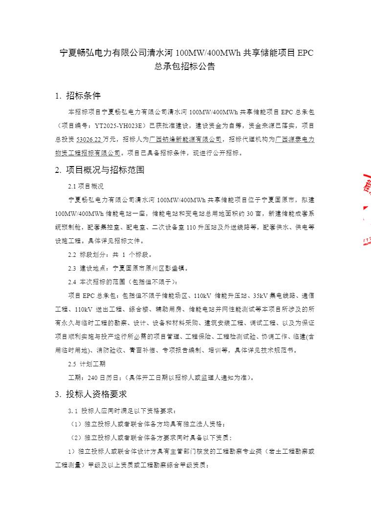 12月30日,宁夏畅弘电力有限公司清水河100MW/400MWh共享储能项目EPC总承包招标公告发布。