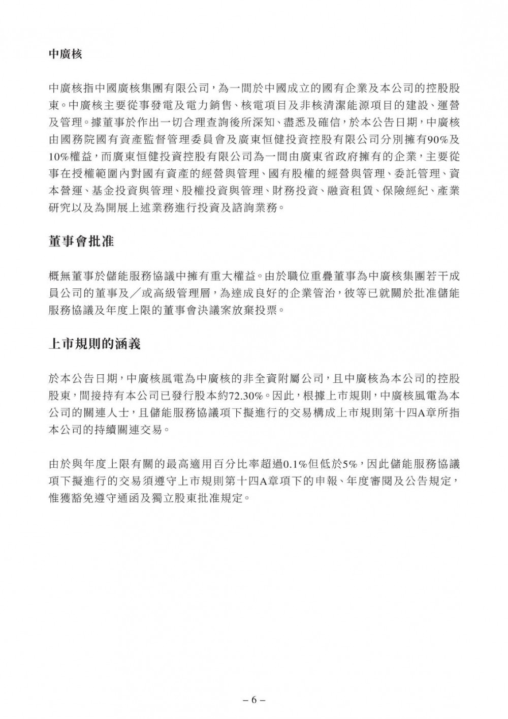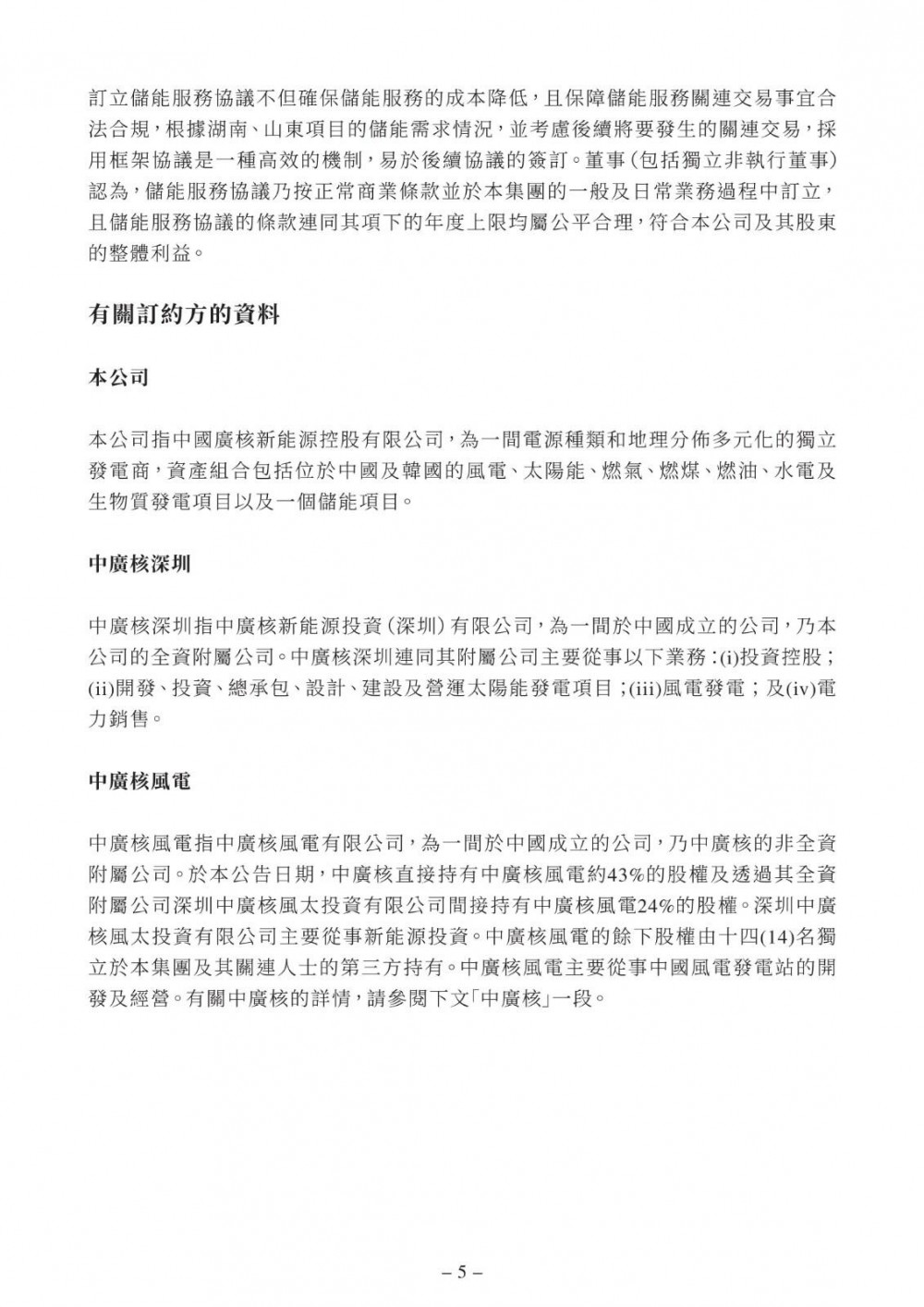 根据储能服务协议,中广核风电同意就中广核深圳于中国山东省及湖南省以及订约方将予确定的其他省份的若干风电及光伏发电场向中广核深圳提供储能服务。