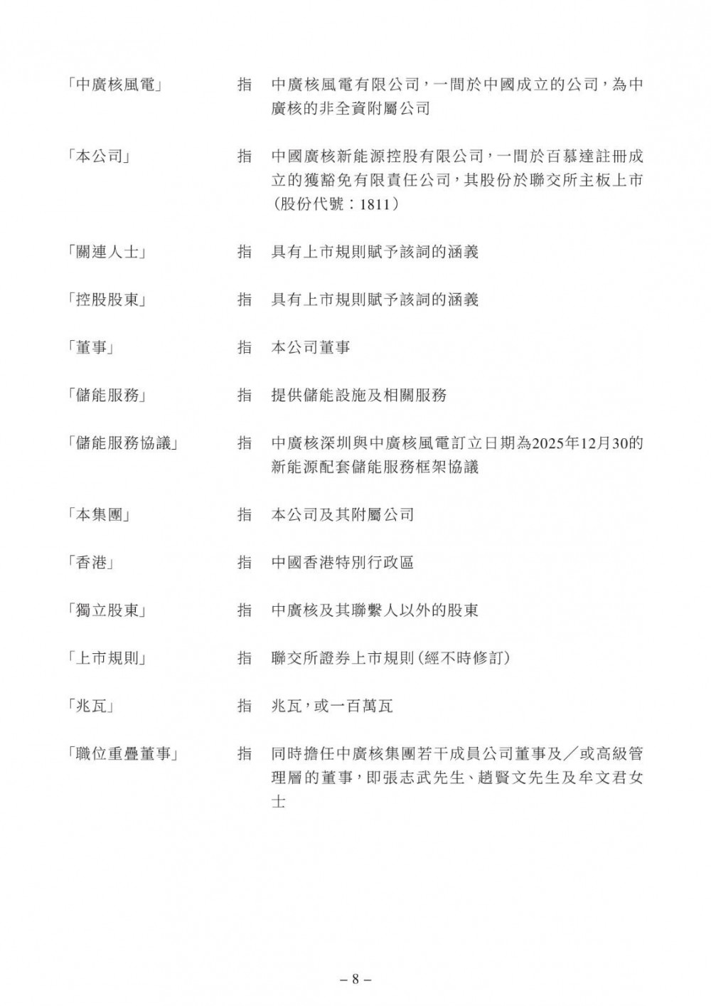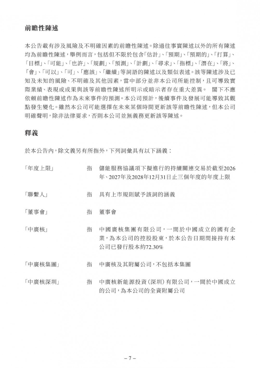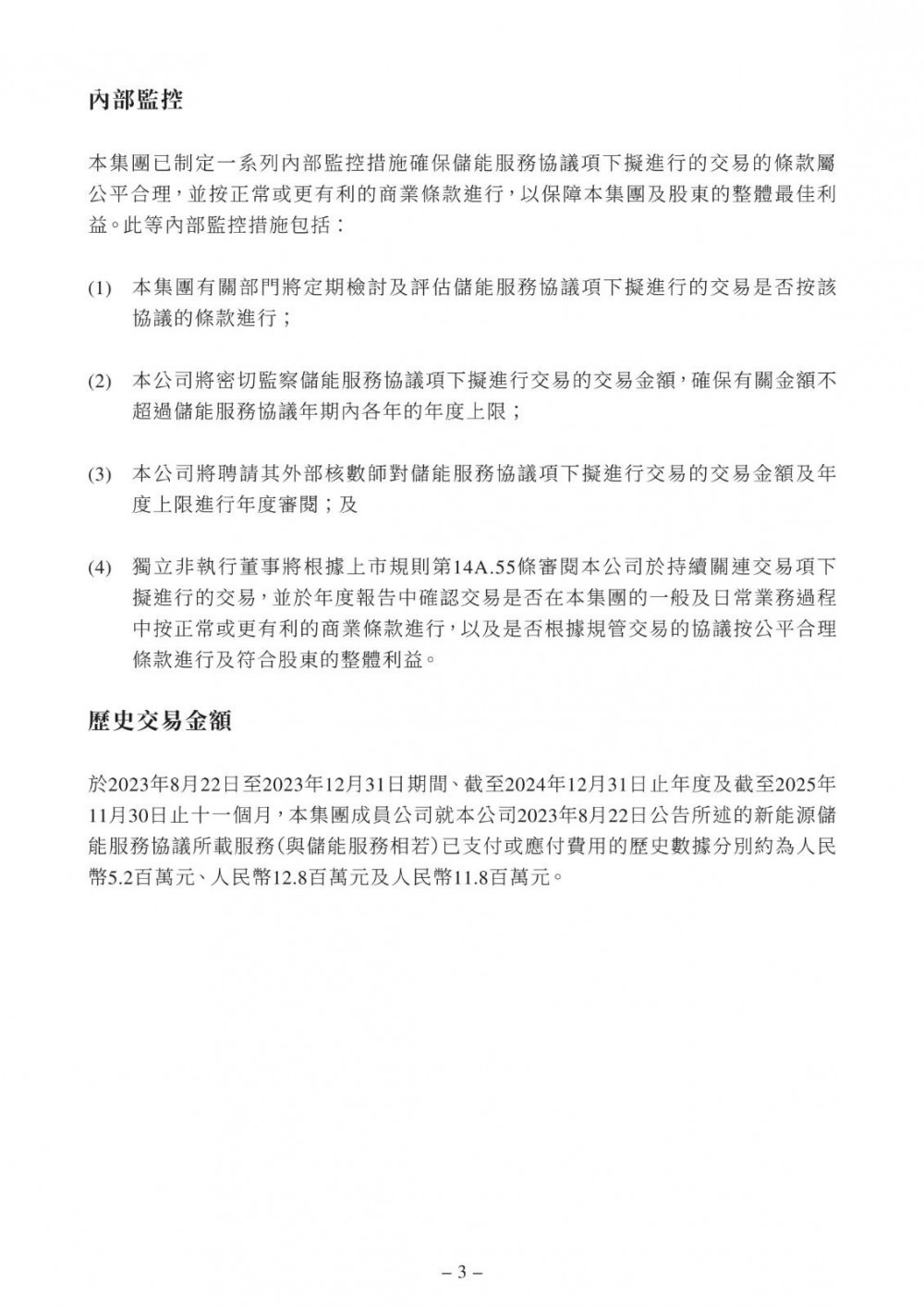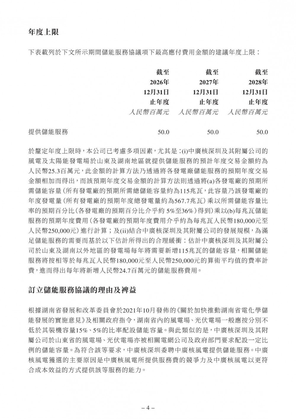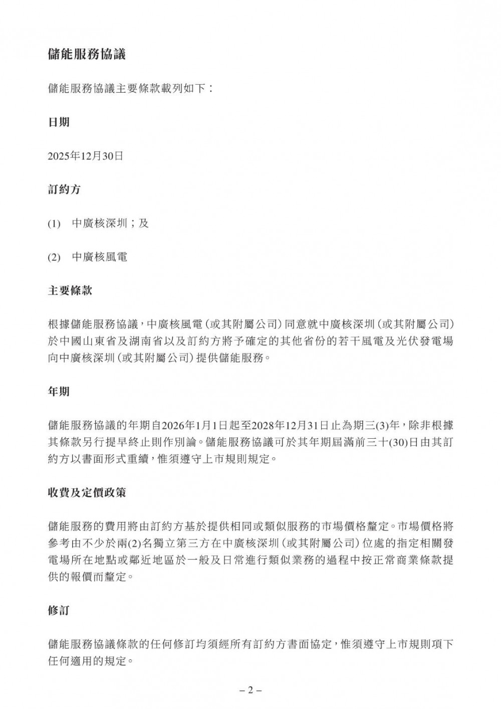 储能服务协议的年期自2026年1月1日起至2028年12月31日止为期三年,除非根据其条款另行提早终止则作别论。储能服务协议可于其年期届满前三十日由其订约方以书面形式重续。