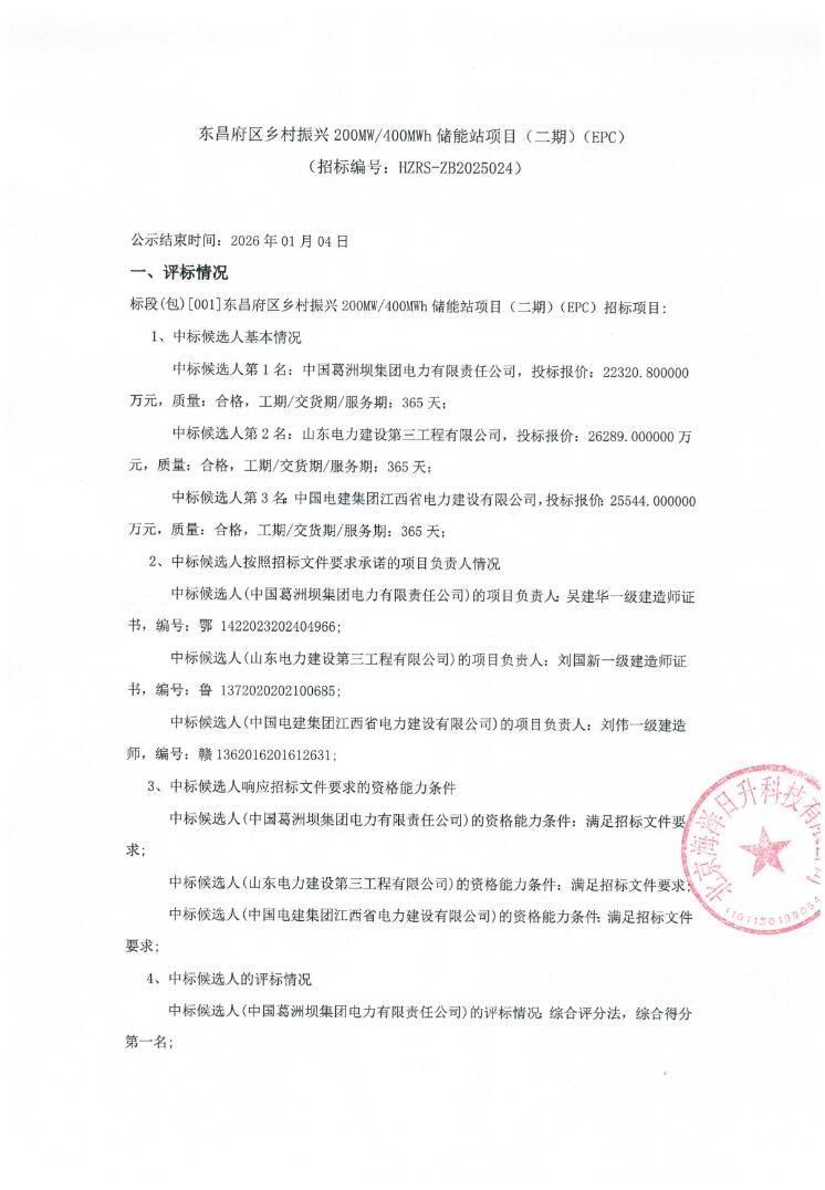 12月30日,东昌府区乡村振兴200MW/400MWh储能站项目(二期)(EPC)中标候选人公示。