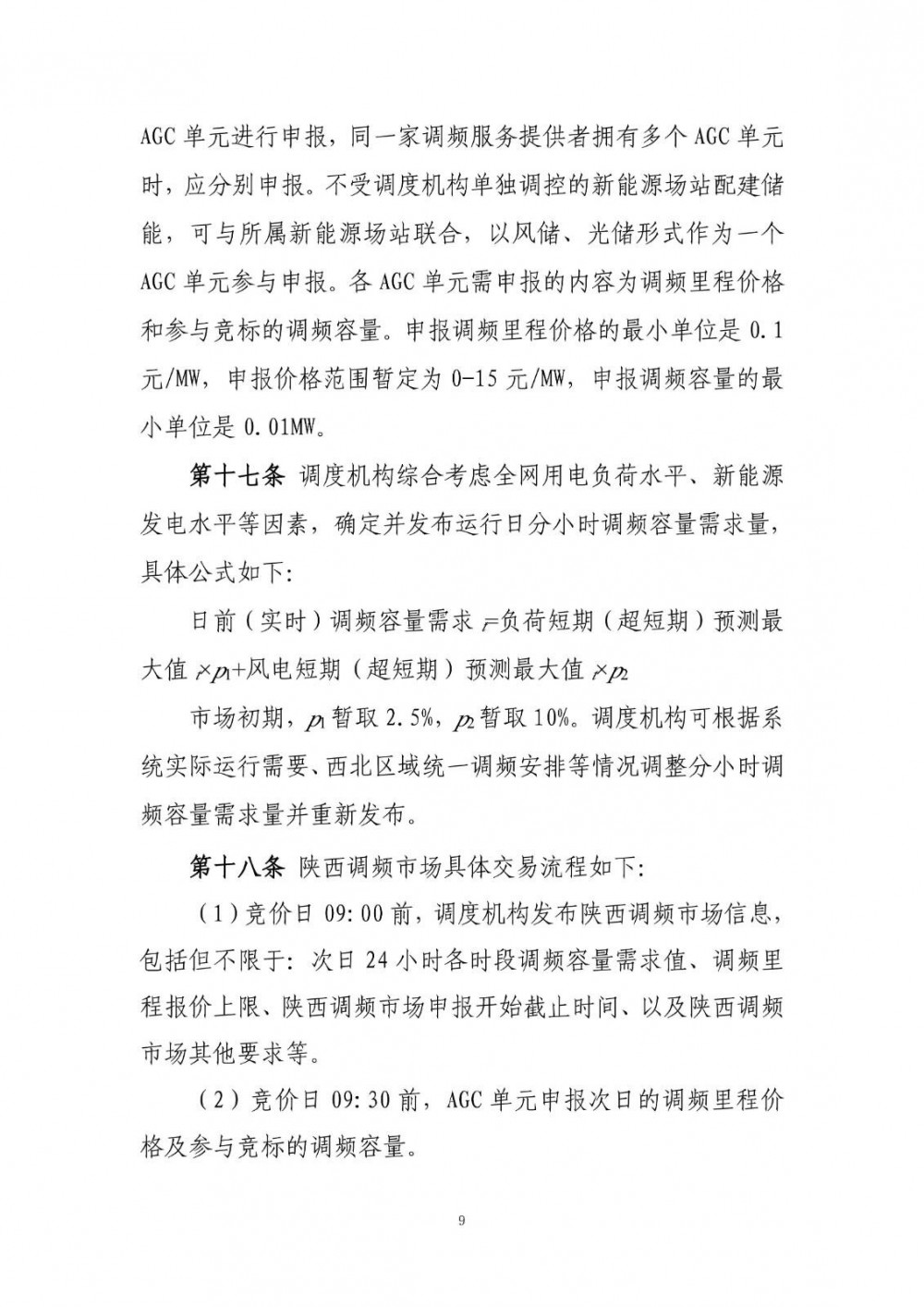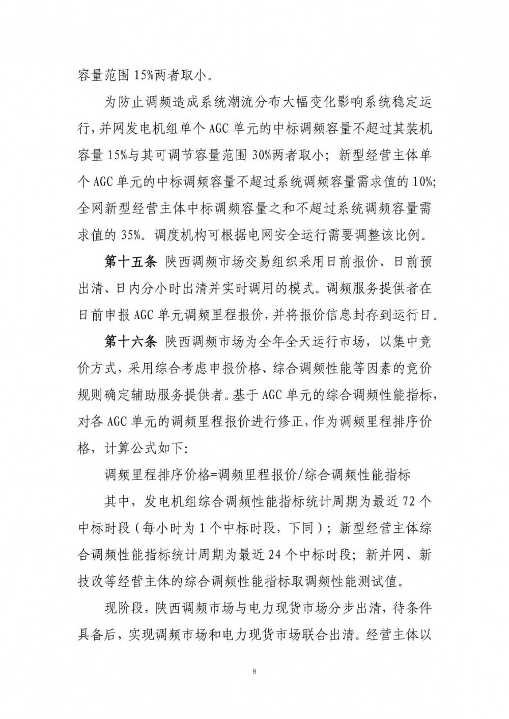 为防止调频造成系统潮流分布大幅变化影响系统稳定运行,并网发电机组单个AGC单元的中标调频容量不超过其装机容量15%与其可调节容量范围30%两者取小;新型经营主体单个AGC单元的中标调频容量不超过系统调频容量需求值的10%;全网新型经营主体中标调频容量之和不超过系统调频容量需求值的35%。调度机构可根据电网安全运行需要调整该比例。