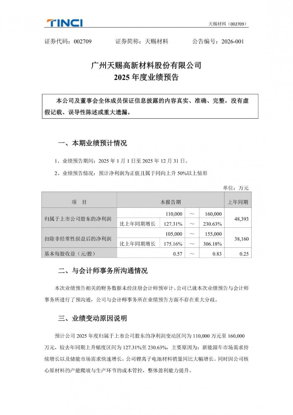 公告显示,预计天赐材料2025年度归属于上市公司股东的净利润变动区间为110,000万元至160,000万元,较去年同期上升幅度区间为127.31%至230.63%,主要原因为:新能源车市场需求持续增长以及储能市场需求快速增长,公司锂离子电池材料销量同比大幅增长。同时因公司核心原材料的产能爬坡与生产环节的成本管控,整体盈利能力提升。